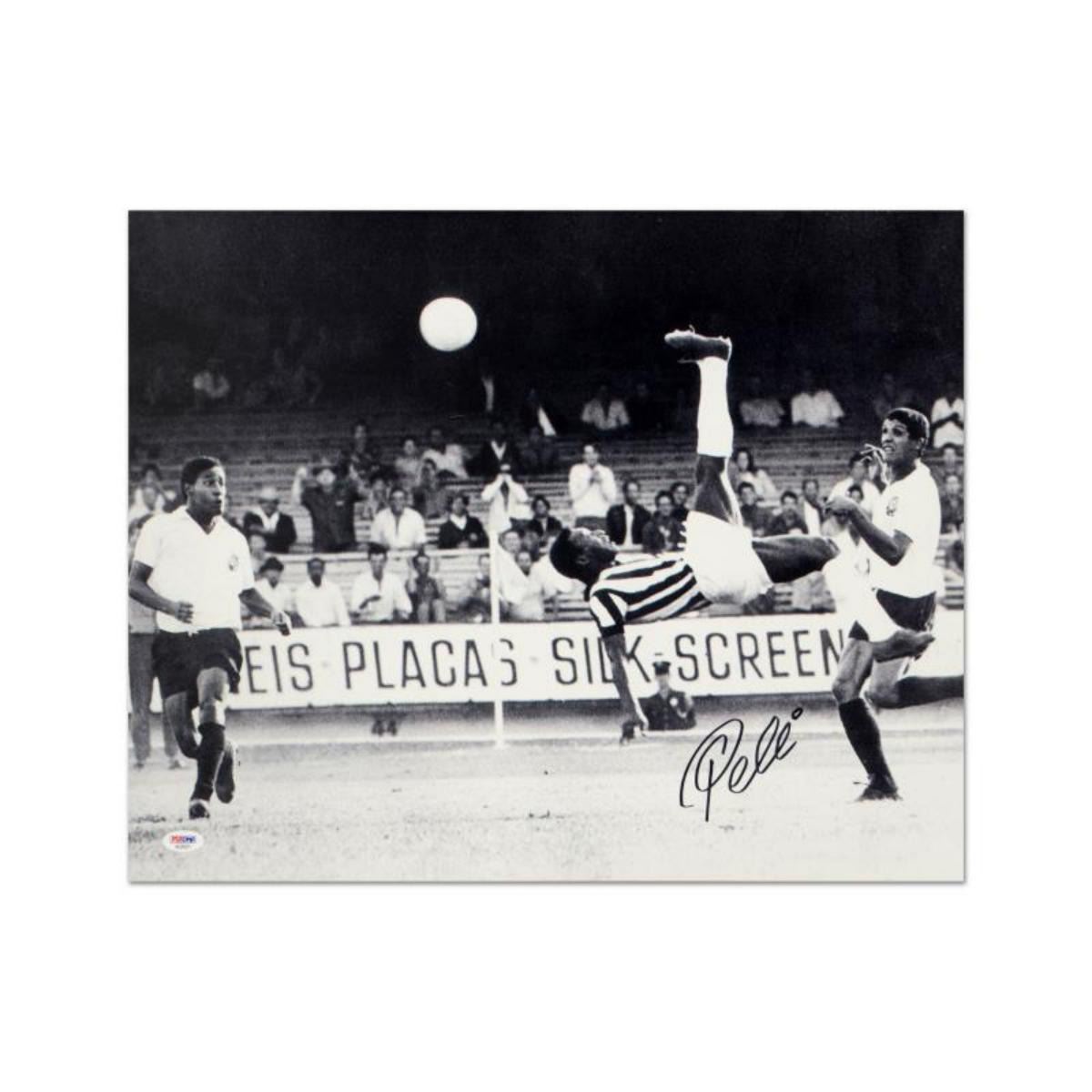 "Scissor Kick" is a print on paper that is autographed by legendary Brazilian footballer, Pele. This piece is presented with a Certificate of Authenticity from PSA/DNA, which authenticates sports memorabilia using proprietary permanent invisible ink as well as a strand of synthetic DNA. We make no additional warranties. Measures approx. 20" x 16" (image). Reference #: 222976.
