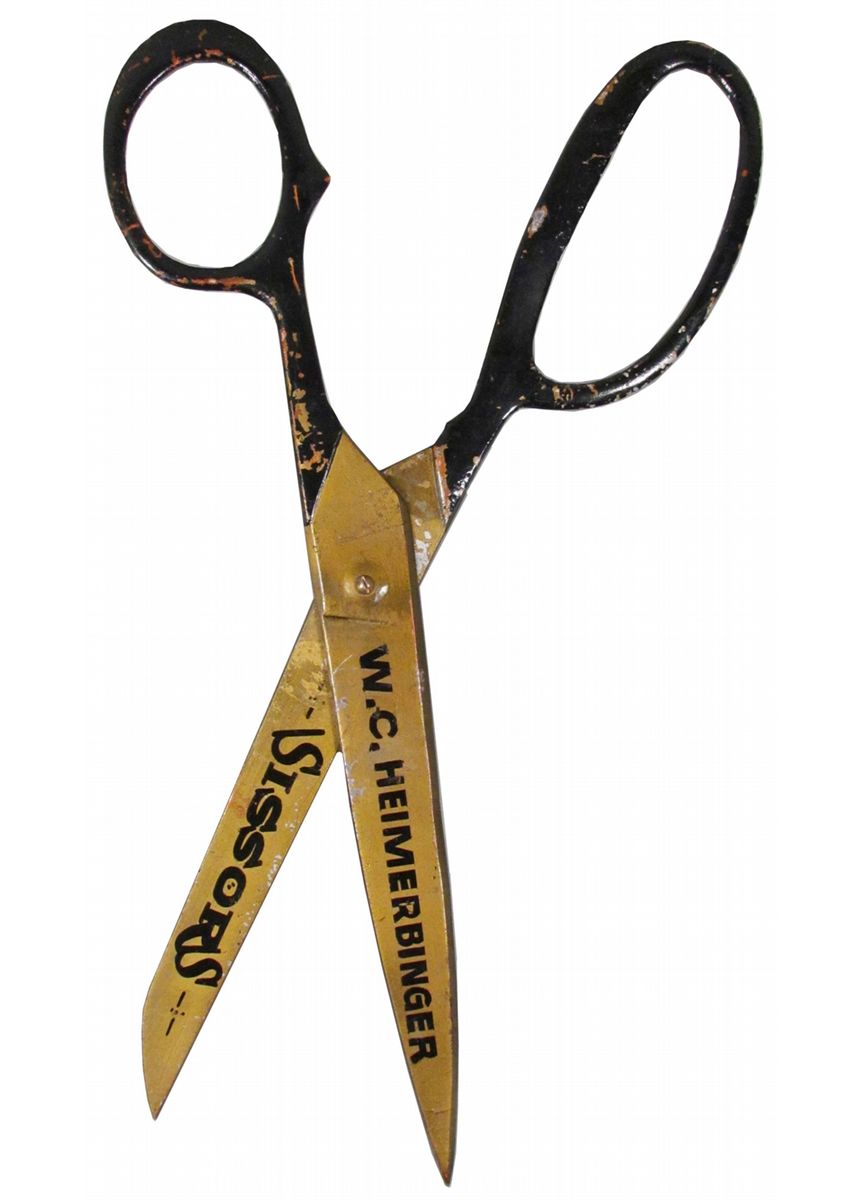Scissors Trade Sign, zinc. W.C. Heimerbinger. Some minor paint loss otherwise very good condition. 22 inches long.