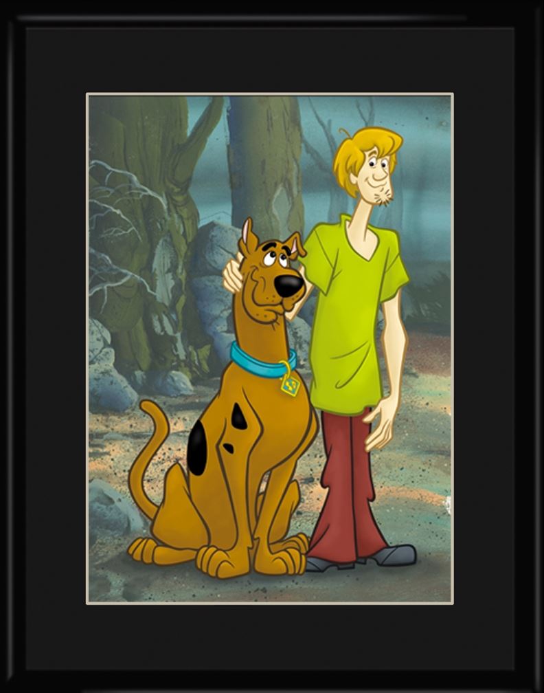 Scooby and Shaggy - Fine Art Giclee. Limited Edition of 500. Comes matted and framed with a certificate of authenticity. Size 16x20.Scooby-Doo is a long-running American animated series produced for Saturday morning television in several different versions from 1969 to the present. The cast (and ages) of characters have varied significantly over the years, the most familiar versions of the show feature a talking dog named Scooby-Doo and four twenty-five-year-olds: Fred "Freddie" Jones, Daphne Blake, Velma Dinkley, and Norville "Shaggy" Rogers. Shaggy’s voice is provided by Top 40 DJ Casey Kasem. Scooby’s speech patterns closely resembled an earlier cartoon dog, Astro from The Jetsons These five characters (officially collectively known as "Mystery, Inc.", but never referred to as such in the original series) drive around in the Mystery Machine van solving mysteries by exposing seemingly otherworldly ghosts and monsters as flesh and blood crooks, with the young investigators discovering that the criminal had used costumes, latex masks and special effects to frighten or deceive witnesses. That puts the series squarely in the old tradition of the "impossible crime" mystery (made famous by such writers as John Dickson Carr).