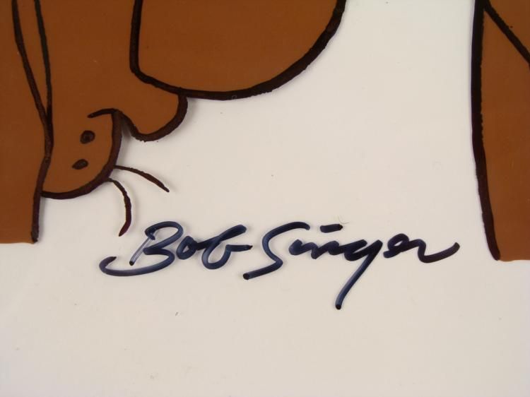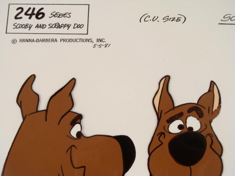 This is an original production animation model cel from the television series "Scooby Doo". There are three different angles of Scooby Doo's head in this cel. Bob Singer's signature appears in black Sharpie at the bottom of the cel.Bob Singer is an American animation artist, character designer, layout and background artist and storyboard director of animated television programs, most memorably of several Hanna Barbara productions such as The Flintstones, Jonny Quest, Scooby-Doo, Yogi Bear, Droopy, Tom and Jerry, The Jetsons, The Smurfs, Superfriends, and the Harlem Globe Trotters cartoons.Each episode of "Scooby Doo" featured Scooby and the four teenaged members of the Mystery, Inc. gang: Fred, Shaggy, Daphne and Velma, arriving to a location in the "Mystery Machine" and encountering a ghost, monster, or other supernatural creature that was terrorizing the local populace. After looking for clues and suspects, and being chased by the monster, the kids come to realize the ghost is anything but, and - often with the help of a Rube Goldberg-like trap designed by Fred - they capture the villain and unmask him.Original Animated Cel, hand-painted, with peg holes along the bottom edge Overall Size of the Cel: 10 1/2" x 12 1/2" Series: 246 "Scooby and Scrappy Doo"Date: 5/5/81, with Hanna-Barbera Productions copyrightTitle: "C.U. Size"Excellent Condition -ready to be matted and framedThis is an original cel used in production. Each one-of-a-kind set-up represents a slight change in position of the characters. When individually photographed and projected in rapid succession, the images appear to move.To create production cels, the original animator's drawing is transferred onto an acetate cel (by hand-inking and/or photo copying). The cel is then hand-painted on the reverse side.