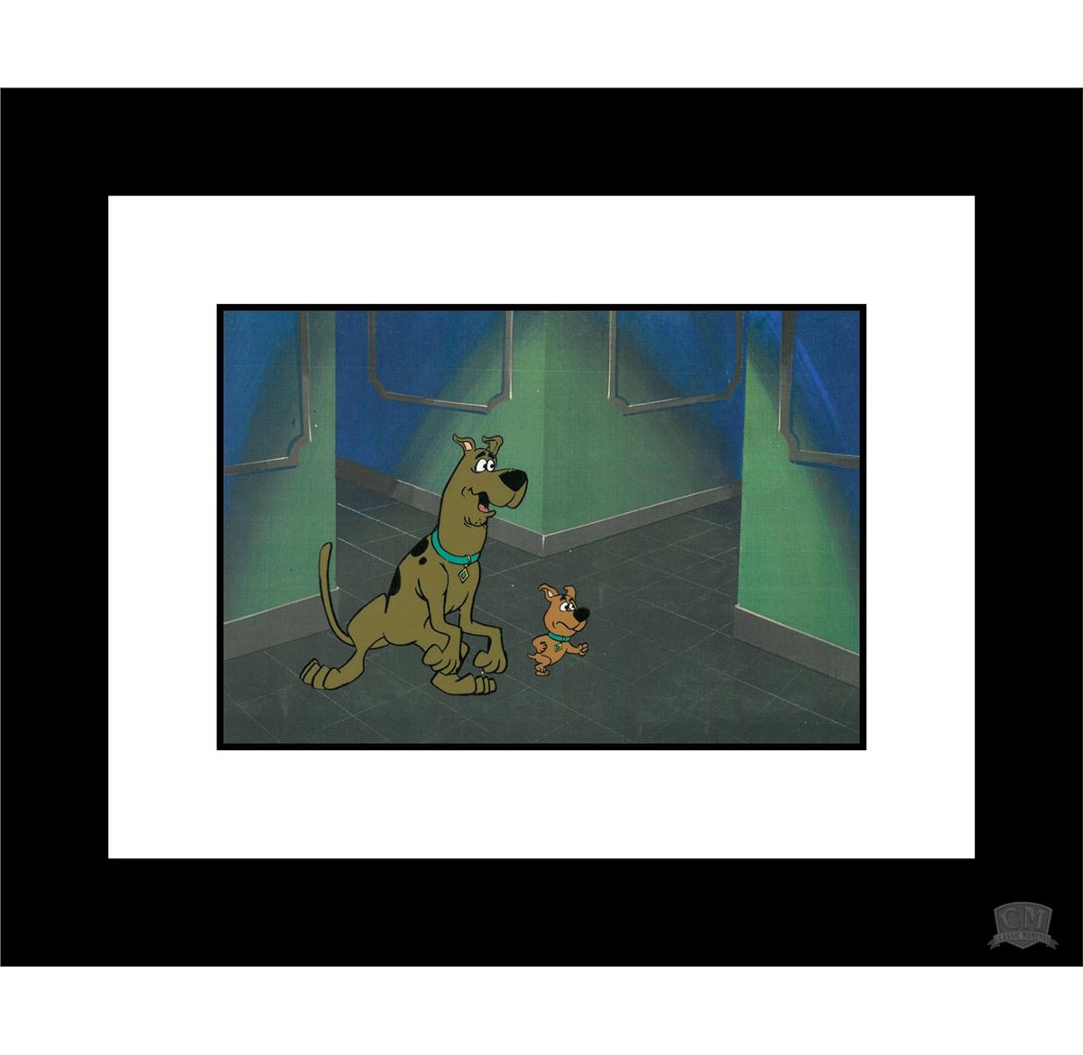 This framed 12-field production cel features two very popular characters Scooby-Doo and Scrappy. This cel has been hand-painted with a reproduction background. Framed 15x18 with COA.