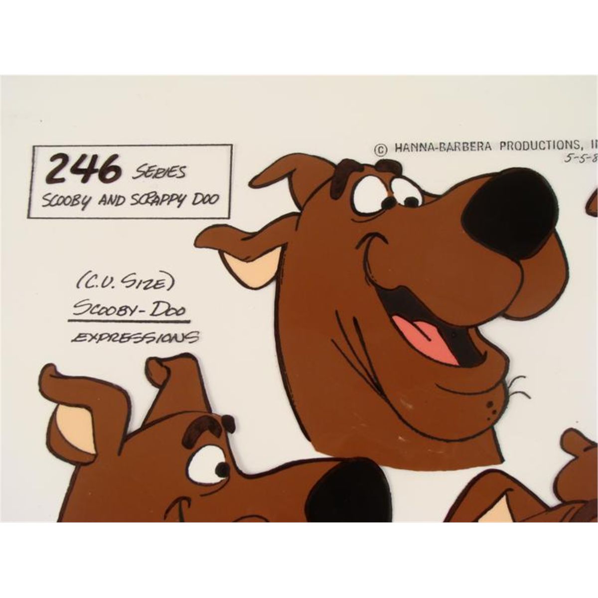 This is an original production animation model cel from the television series "Scooby Doo". * Here are four head poses of Scooby Doo, showing his different zany expressions. Each episode of "Scooby Doo" featured Scooby and the four teenaged members of the Mystery, Inc. gang: Fred, Shaggy, Daphne and Velma, arriving to a location in the "Mystery Machine" and encountering a ghost, monster, or other supernatural creature that was terrorizing the local populace. After looking for clues and suspects, and being chased by the monster, the kids come to realize the ghost is anything but, and - often with the help of a Rube Goldberg-like trap designed by Fred - they capture the villain and unmask him. * Original Animated Cel, hand-painted, with peg holes along the bottom edge Overall Size of the Cel: 10 1/2" x 12 1/2" Series: 246 "Scooby and Scrappy Doo"Date: 5/5/81, with Hanna-Barbera Productions copyrightTitle: "Scooby-Doo Expressions" * Excellent Condition -ready to be matted and framedThis is an original cel used in production. Each one-of-a-kind set-up represents a slight change in position of the characters. When individually photographed and projected in rapid succession, the images appear to move. * To create production cels, the original animator's drawing is transferred onto an acetate cel (by hand-inking and/or photo copying). The cel is then hand-painted on the reverse side. * * *