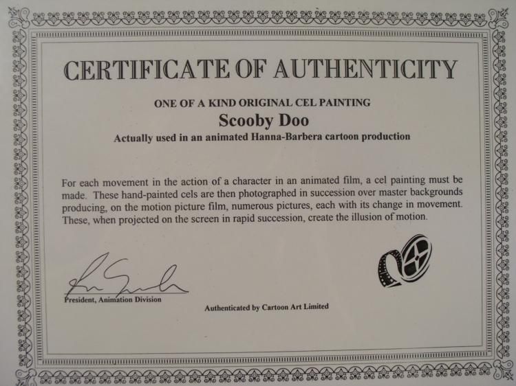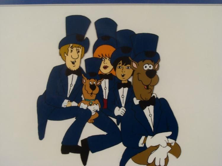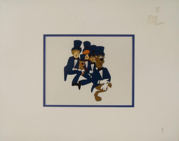 This is an original animation cel used in the production of a Scooby Doo cartoon. This cel is great because it shows Scooby and the whole gang, including Scrappy, and their dressed in tuxedos! * Medium: Hand-inked and hand-painted acetate celImage size: 9 1/2 x 7 1/2 inchesPresentation: Double matted in blue and whiteMatte size: 20 x 16 inchesCondition: Excellent; sealed in cellophaneCertificate of Authenticity: Included