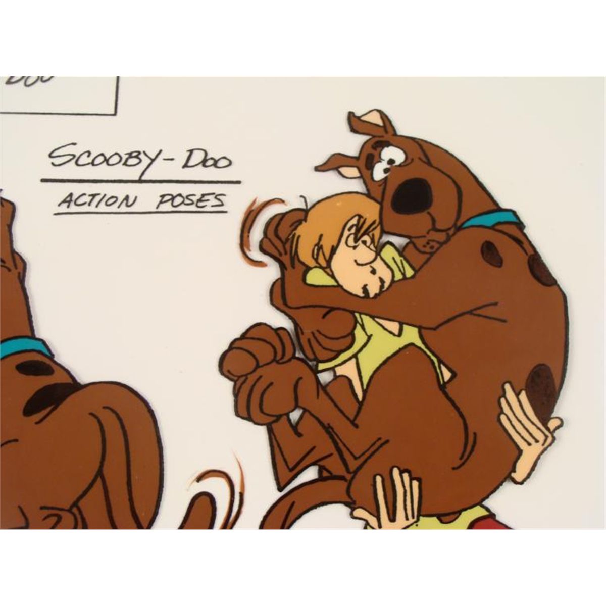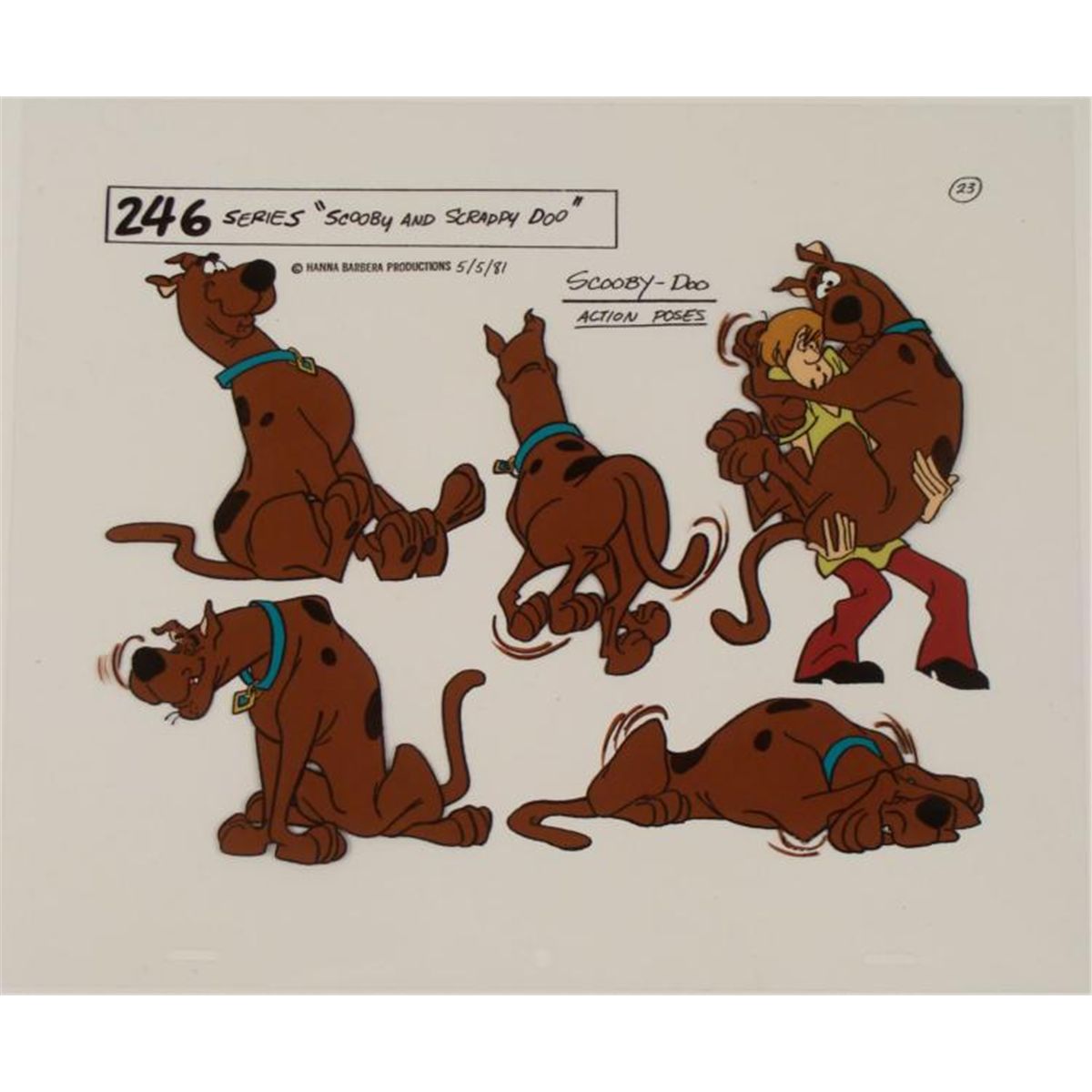 This is an original production animation model cel from the television series "Scooby Doo". This cel has 8 images of Scooby Doo, one with Shaggy, all showing his different action poses. * Each episode of "Scooby Doo" featured Scooby and the four teenaged members of the Mystery, Inc. gang: Fred, Shaggy, Daphne and Velma, arriving to a location in the "Mystery Machine" and encountering a ghost, monster, or other supernatural creature that was terrorizing the local populace. After looking for clues and suspects, and being chased by the monster, the kids come to realize the ghost is anything but, and - often with the help of a Rube Goldberg-like trap designed by Fred - they capture the villain and unmask him. * Original Animated Cel, hand-painted, with peg holes along the bottom edge Overall Size of the Cel: 10 1/2" x 12 1/2" Series: 246 "Scooby and Scrappy Doo"Date: 5/5/81, with Hanna-Barbera Productions copyrightTitle: "Scooby-Doo Action Poses" * Excellent Condition -ready to be matted and framedThis is an original cel used in production. Each one-of-a-kind set-up represents a slight change in position of the characters. When individually photographed and projected in rapid succession, the images appear to move. * To create production cels, the original animator's drawing is transferred onto an acetate cel (by hand-inking and/or photo copying). The cel is then hand-painted on the reverse side. * * *