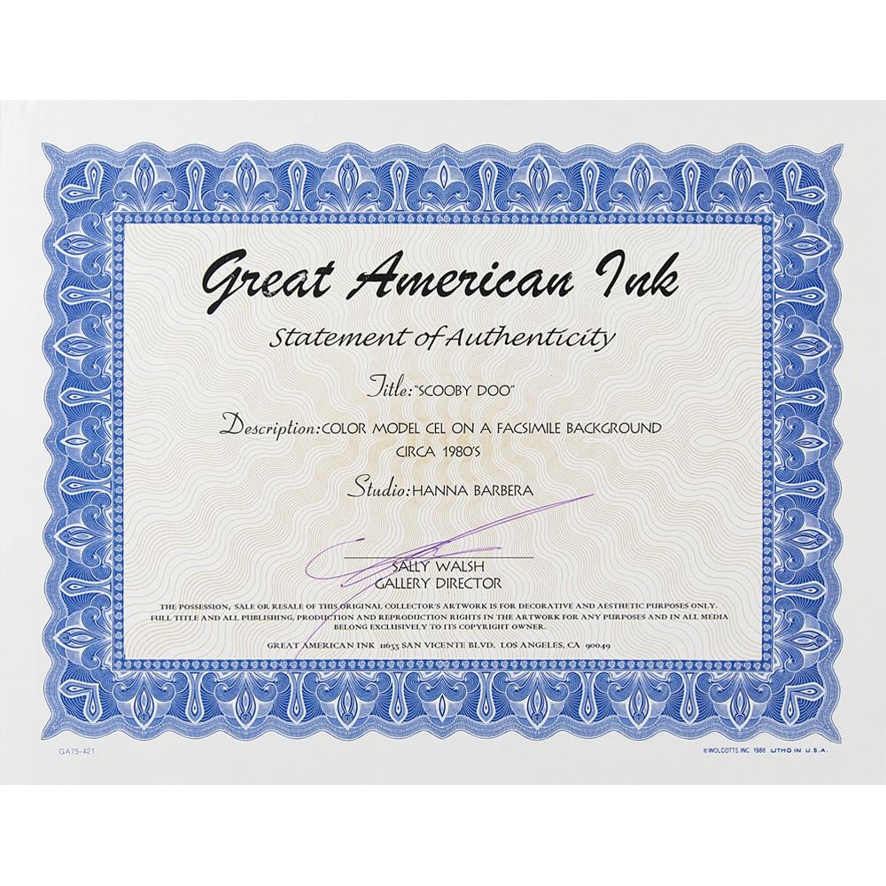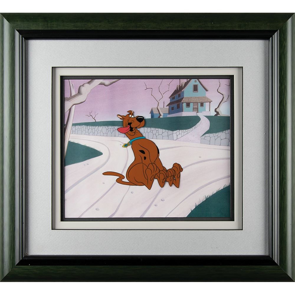 (Hanna-Barbera Studios, circa 1980s) Original production cel of Scooby-Doo from an unknown Hanna-Barbera production, depicting the crime-solving Great Dane in a great full-length pose, sliding into the scene with his big tongue lolling about. The cel is placed on an attractive matching facsimile background of a road with a creepy haunted house set on a hill. Character image measures 5.75 x 5.5, with a mat opening of 11.5 x 9.5. Triple-matted and framed to an overall size of 20.75 x 18.5. In fine condition. Accompanied by a statement of authenticity from Great American Ink.