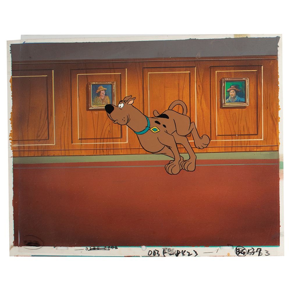 (Hanna-Barbera Studios, 1970s-80s) Original full-bodied 1970s production cel featuring Scooby-Doo, placed on a hand-painted production background from a 1980s Scooby-Doo cartoon. Image measures 5 x 4, with overall dimensions of 13.25 x 10.5. In fine condition. A great Scooby set-up.