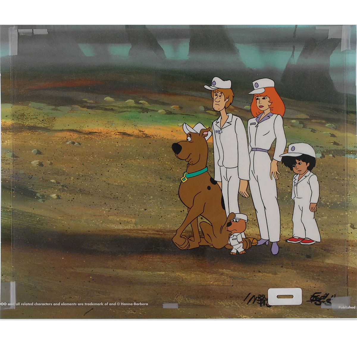 Original hand-painted production cel of Scooby Doo, Scrappy Doo, Shaggy, Daphne, and Flim Flam, on a 12.5 x 10.5 acetate sheet, set against a pre-printed color 14 x 11 background. In fine condition.