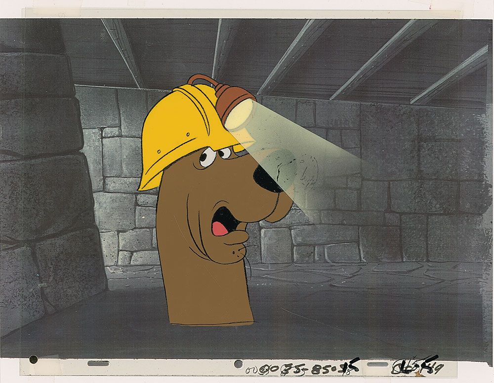 Original hand-painted production cel of Scooby Doo wearing a mining hat on a 12.5 x 10.5 acetate sheet, set against a pre-printed color 14 x 11 background. In fine condition.