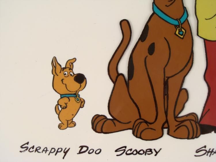 This is an original production animation model cel from the television series "Scooby Doo". * Here are Shaggy, Scooby, and his nephew Scrappy Doo, all pictured side by side to give the animator an idea of their sizes in relation to one another. * Bob Singer's signature appears in black Sharpie at the bottom of the cel. * Bob Singer is an American animation artist, character designer, layout and background artist and storyboard director of animated television programs, most memorably of several Hanna Barbara productions such as The Flintstones, Jonny Quest, Scooby-Doo, Yogi Bear, Droopy, Tom and Jerry, The Jetsons, The Smurfs, Superfriends, and the Harlem Globe Trotters cartoons. * Each episode of "Scooby Doo" featured Scooby and the four teenaged members of the Mystery, Inc. gang: Fred, Shaggy, Daphne and Velma, arriving to a location in the "Mystery Machine" and encountering a ghost, monster, or other supernatural creature that was terrorizing the local populace. After looking for clues and suspects, and being chased by the monster, the kids come to realize the ghost is anything but, and - often with the help of a Rube Goldberg-like trap designed by Fred - they capture the villain and unmask him. * Original Animated Cel, hand-painted, with peg holes along the bottom edge Overall Size of the Cel: 10 1/2" x 12 1/2" Series: 246 "Scooby and Scrappy Doo"Date: 5/5/81, with Hanna-Barbera Productions copyrightTitle: "Standard Size Comparison" * Excellent Condition -ready to be matted and framedThis is an original cel used in production. Each one-of-a-kind set-up represents a slight change in position of the characters. When individually photographed and projected in rapid succession, the images appear to move. * To create production cels, the original animator's drawing is transferred onto an acetate cel (by hand-inking and/or photo copying). The cel is then hand-painted on the reverse side. * * *