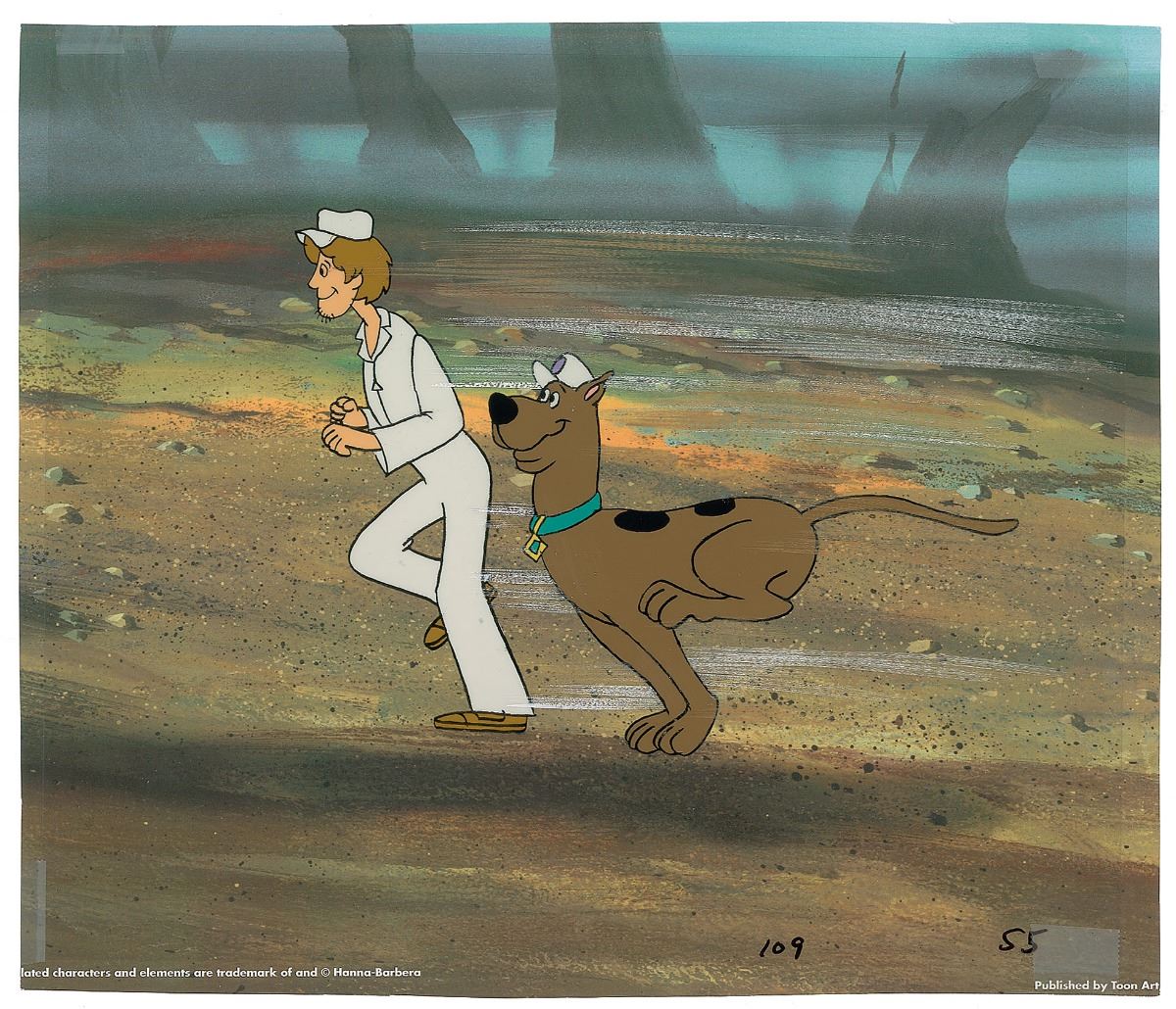 (Hanna-Barbera Studios, 1985) Original production cel featuring Scooby and Shaggy from The 13 Ghosts of Scooby-Doo, showing the pair running through the forest. The cel is placed on a color copy background. Character image measures 8.5 x 6, with overall dimensions of 14 x 11. In fine condition.