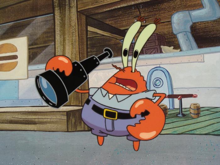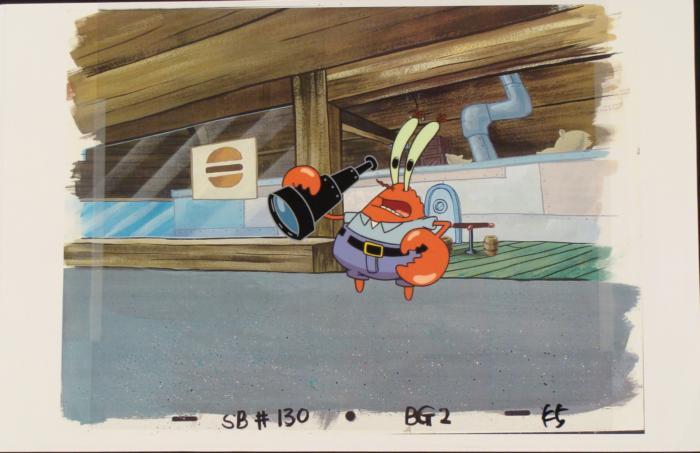 This original hand-painted background and animation cel is from the Nickelodeon TV show SpongeBob Squarepants. The story takes place under the deep blue sea in Bikini Bottom, where SpongeBob resides. SpongeBob, who is a yellow, porous sponge, is your typical happy-go-lucky character, as he is always cheerful and enjoys making people laugh. Patrick Star, SpongeBob's neighbor who is a starfish, is your average children's show idiot, as he boasts knowing nothing and is often getting himself into ridiculous situations. Between the homes of these two lies the home of the miserable Squidward, a squid, who is known for being grouchy and playing tricks on SpongeBob and Patrick. Both SpongeBob and Squidward work at the Krusty Krab, a fast food business run by the greedy money-loving Mr. Krabs, a crab, the arch rival of the evil, possibly misunderstood, Plankton. Another neighbor, Sandy Cheeks, an athletic squirrel who normally wears an astronaut's space suit, was introduced in "Tea at the Treedome." She spends most of her time inventing and experimenting. Mr. Krabs is next to the Krusty Krabs.Original Production Background and Animated Cel Overall Size of Background: 11" x 17" Overall Size of the Cels: 10 1/2" x 12 1/2" Very good condition; it has been stored This is an original hand-painted cel set-up used in the production of an episode of "SpongeBob SquarePants." Each one-of-a-kind set-up represents a slight change in position of the characters. When individually photographed and projected in rapid succession, the images appear to move.