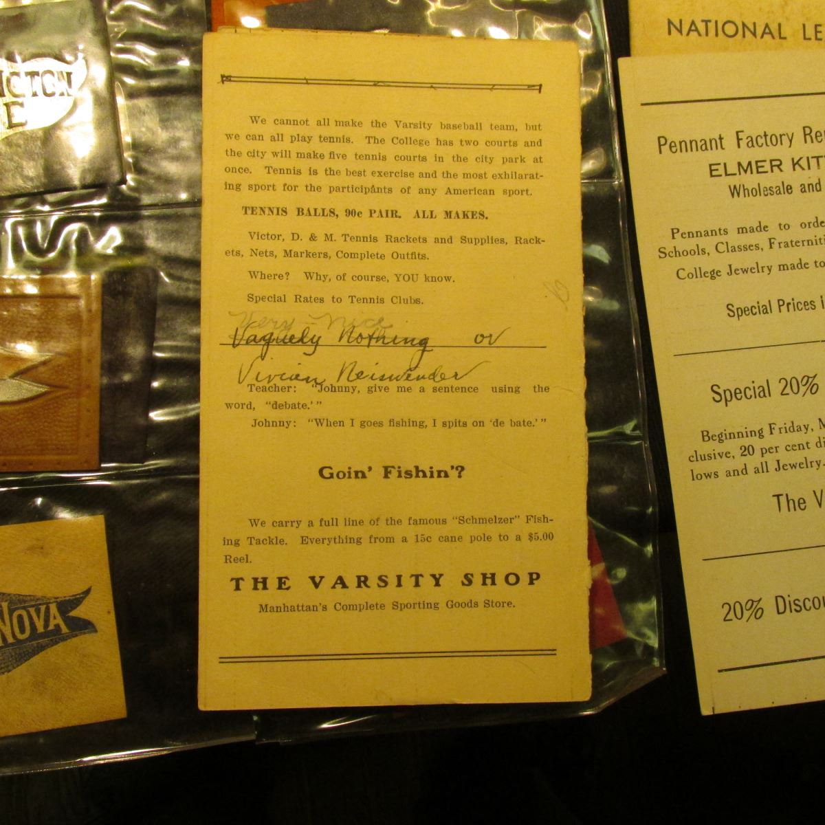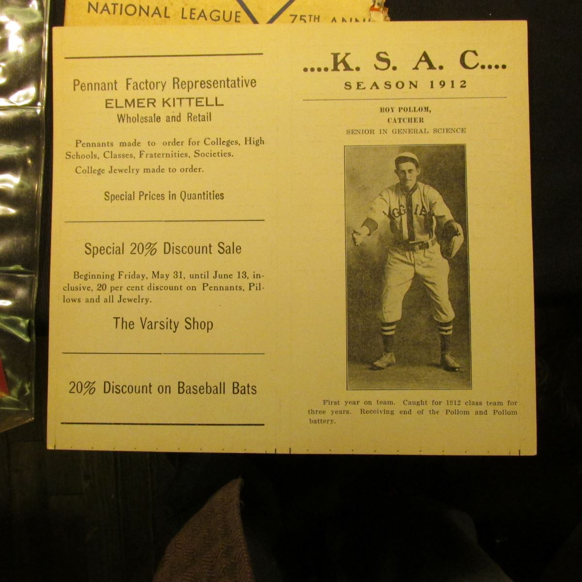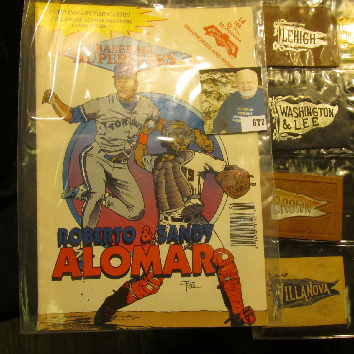 Scorecard with mouse damage "New York Giants 1951"; (2) different 1912 Baseball Score cards; 1992 era comic book "Baseball Superstars Roberto & Sandy Alomar", mint condition; & (23) leather Tobacco Premiums of various colleges, which 'Doc' used to sell at $14.00 each.