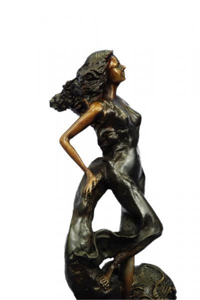 Scorpio from the Circle of Life fine art interpretation of Scorpio, the great scorpion of myth and love, a contemplative and brooding young woman feeling the sting of uncertainty has been added to accompany the gigantic scorpion of the ancients to punctuate his dramatic presentation of Scorpio and to emphasize that the painfulness of a sting can be emotional as well as physical. In deference to the world of astrology, Tuan has set this unique sculpture atop a sphere that represents Pluto surrounded by the element of water. It has been cast using the lost wax method and set atop a marble base. Bronze Dimensions with Marble Base: Height 15 X Width 8 inches. Weight: 12 LBS.