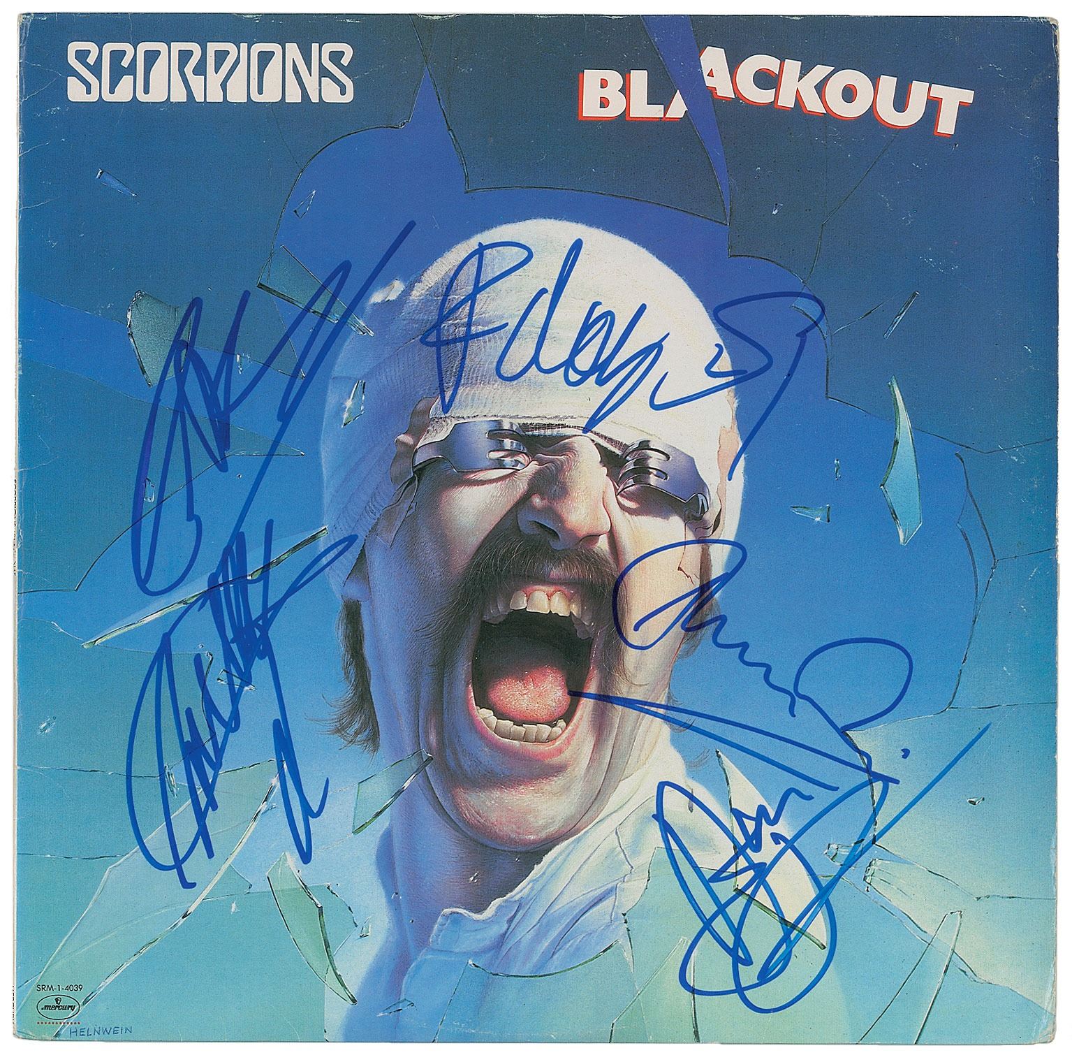 Blackout album signed on the front cover in blue felt tip by Rudolf Schenker, Francis Buchholz, Klaus Meine, Herman Rarebell, and Matthias Jabs. In fine condition. The record is included.