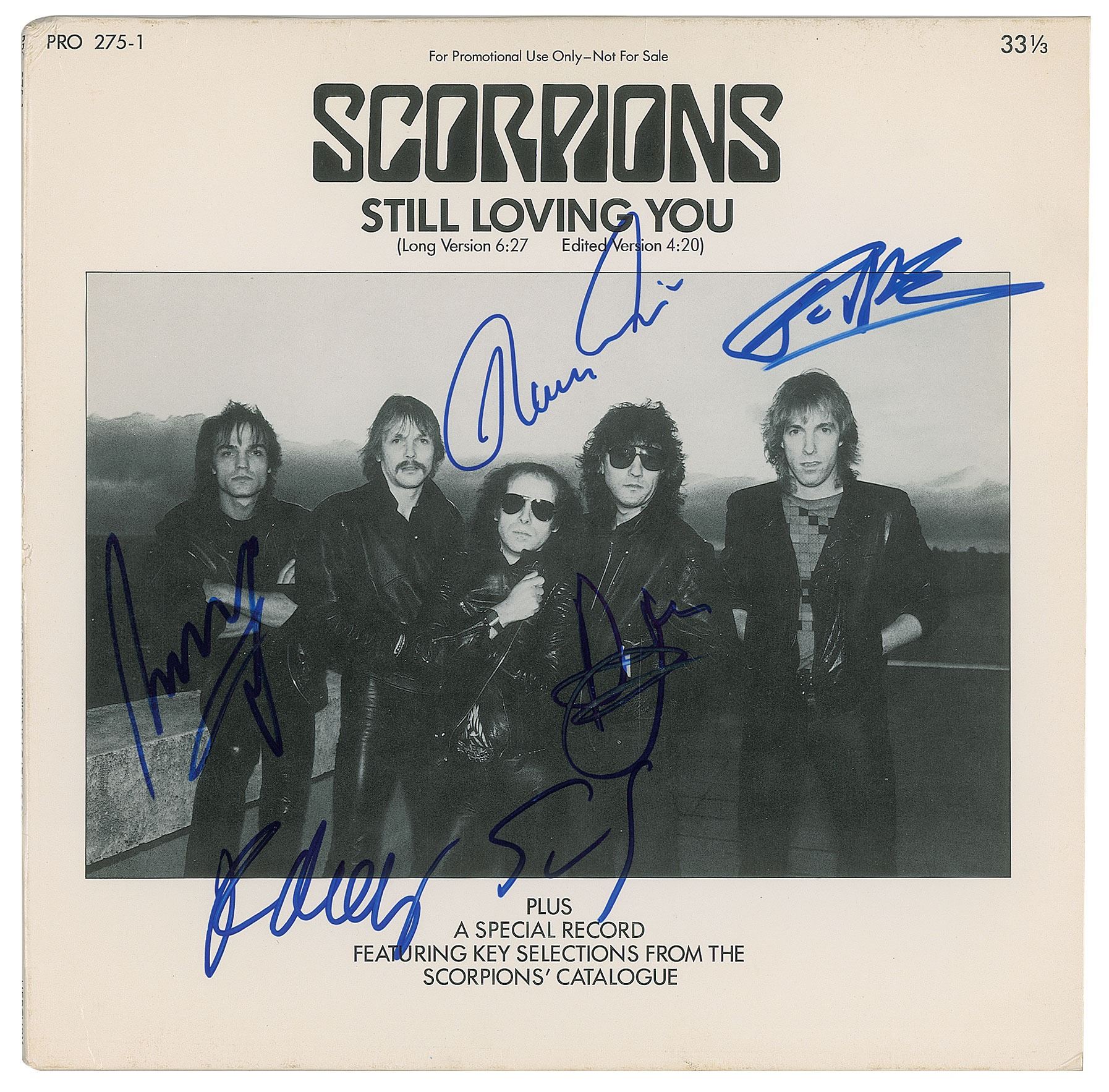 'Still Loving You' promotional single album by Scorpions, signed on the front cover in blue felt tip by Rudolf Schenker, Herman Rarebell, Klaus Meine, Francis Buchholz, and Matthias Jabs. In fine condition. The record is included.