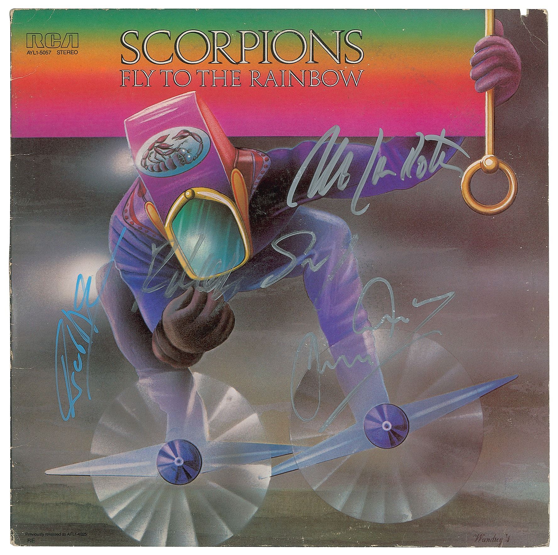 Fly to the Rainbow album by Scorpions, signed on the front cover in silver ink by Rudolf Schenker, Uli Jon Roth, and Klaus Meine, and in blue paint pen by Francis Buchholz. In fine condition, with a small area of old price sticker residue. The record is not included.