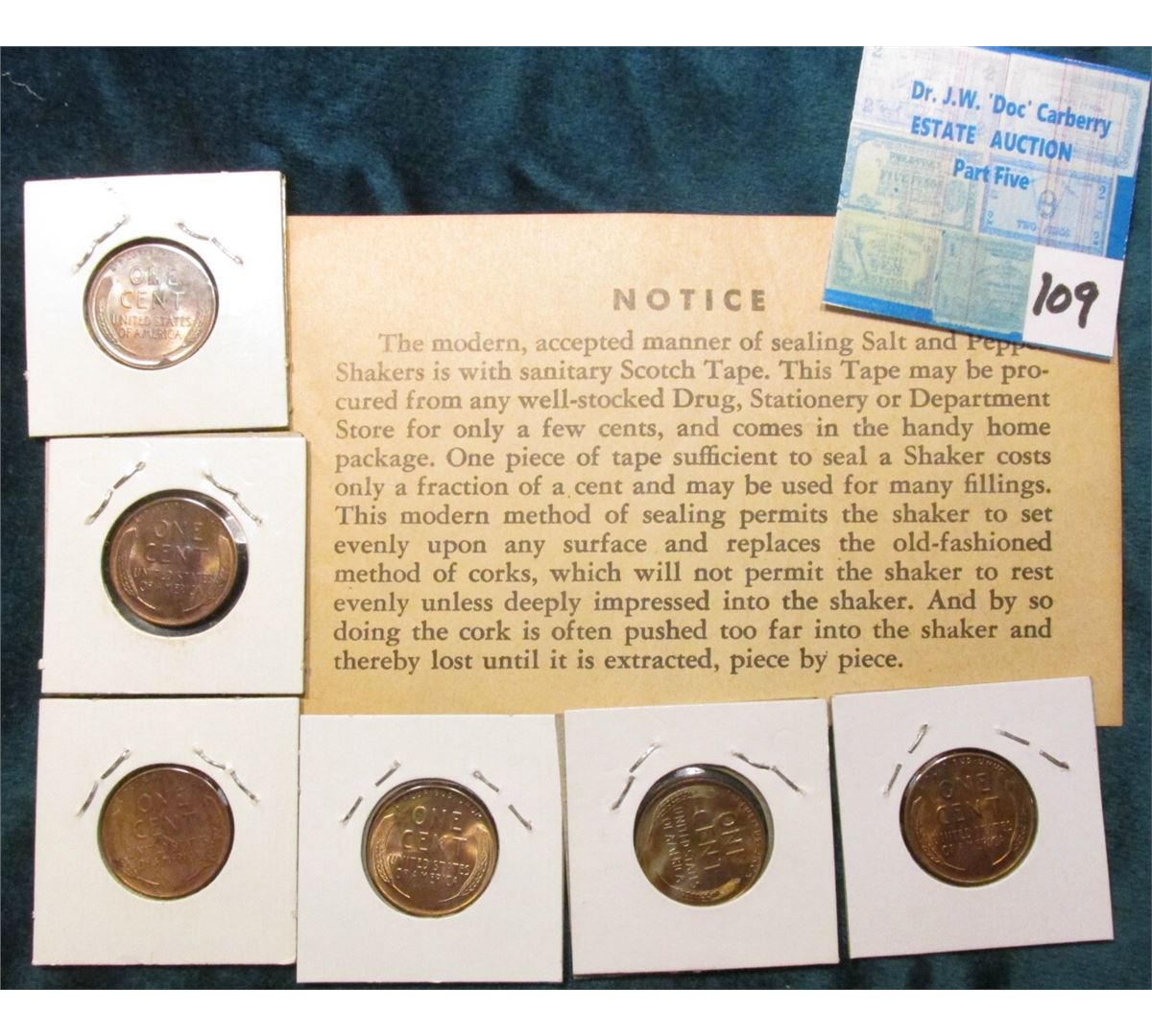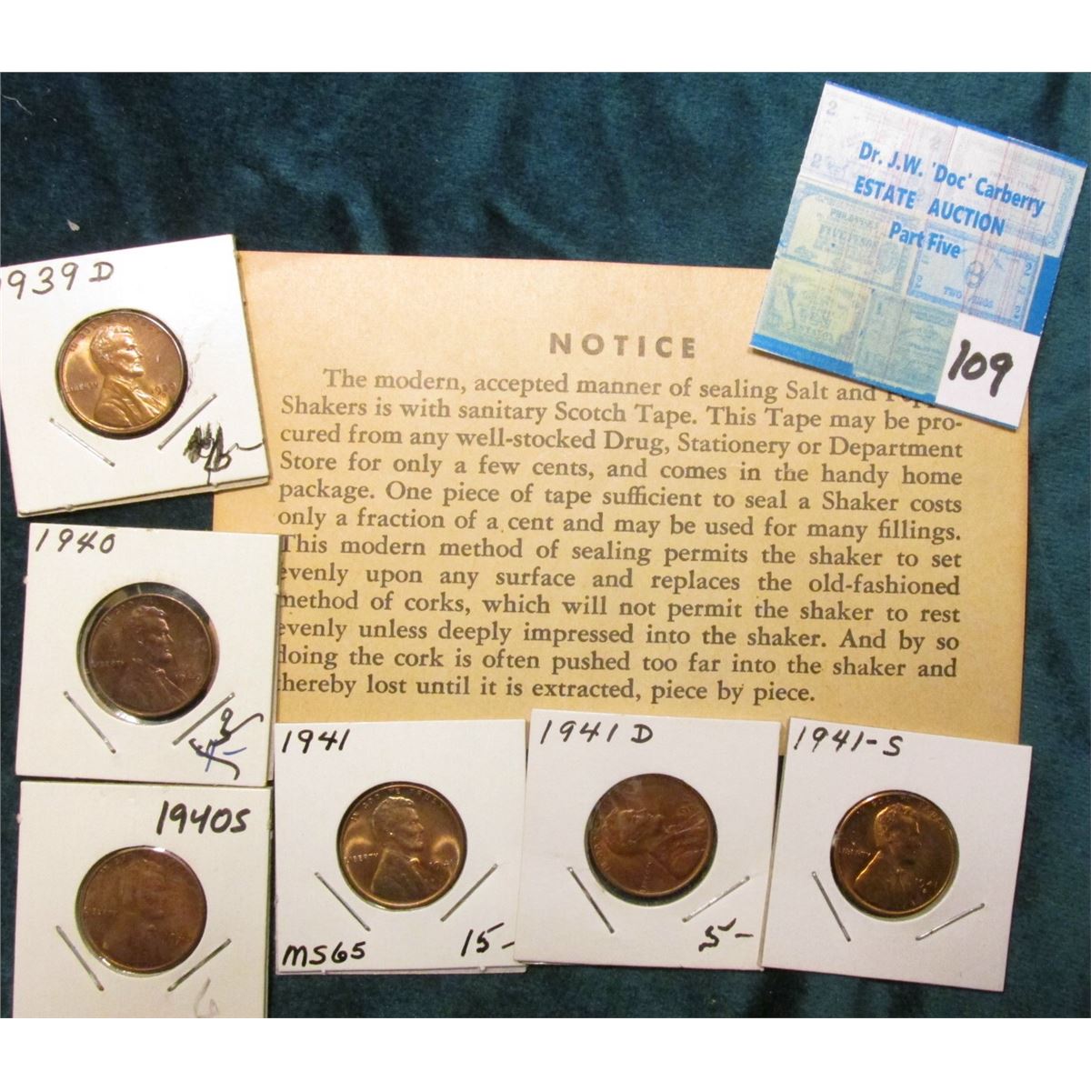 "Scotch Tape" Advertising Card suggesting you seal your Salt & Pepper Shakers with their tape; 1939D, 40P, S, 41P, D, & S BU Lincoln Cents.