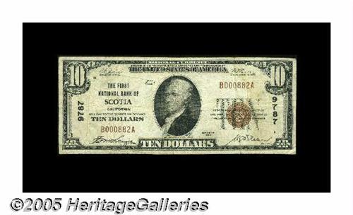 <B>Scotia, CA</B></I> - $10 1929 Ty. 1 <B>The First NB</B></I> Ch. # 9787<BR>This <B>Fine-Very Fine</B></I> example is from the only issuer in this Humboldt County locale, once known as Forestville. Large notes from here are prohibitively rare, making the 1929 series all the more eagerly sought. <B>Fine-Very Fine</B></I> and likely to sell in the range of...