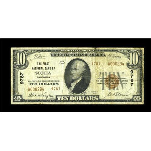 <B>Scotia, CA</B></I> - $10 1929 Ty. 2 <B>The First NB</B></I> Ch. # 9787<BR> Pleasing margins are seen on this <B>Fine</B></I> example that is cut a touch better than is normally seen.<B></B></I><BR><I>From The Kansas City Collection.</B></I><BR><BR><b>Shipping:</b> Coins & Currency (<a target="_blank" href="http://www.heritageauctions.com/common/shipping.php">view shipping information</a>)