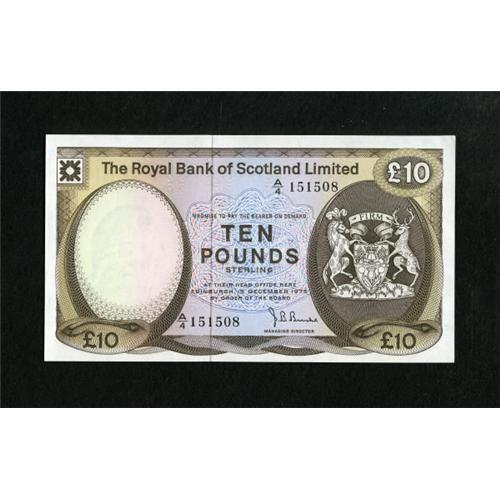 <B>Scotland </B></I> $10 Royal Bank of Scotland Limited 1975 Pick 338a <BR> This is a delightful note that reveals a counting crinkle and corner tip bump. <B>Crisp Uncirculated.</B></I><BR><BR><b>Shipping:</b> Coins & Currency (<a target="_blank" href="http://www.heritageauctions.com/common/shipping.php">view shipping information</a>)