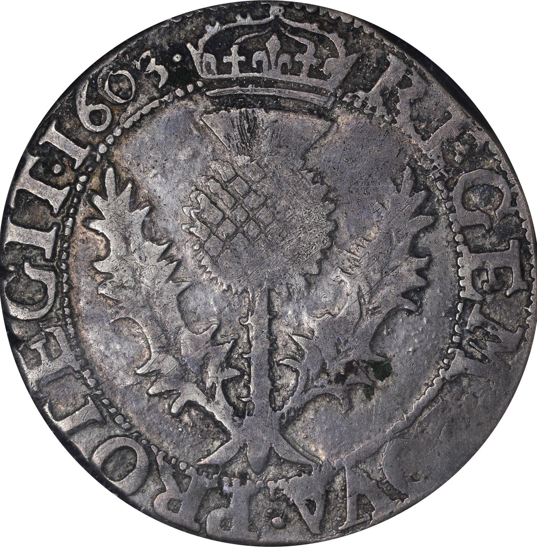 Title: Scotland. 1603 Silver Merk. James VI. Crowned Thistle Type. KM-16. VF-20 NGC.