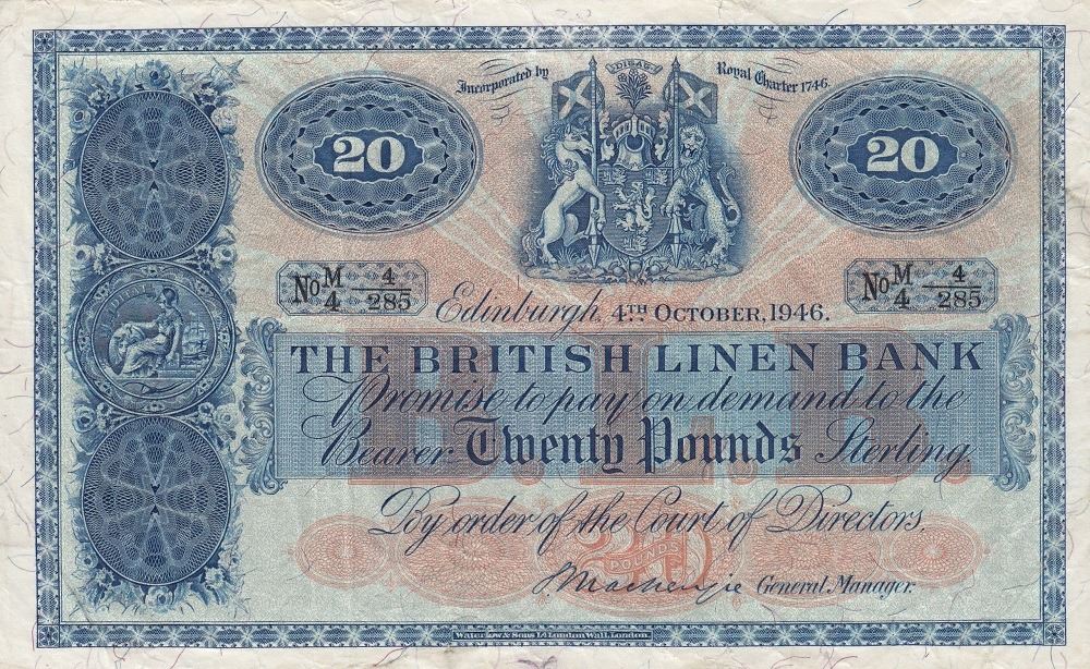 Scotland, 20 Pounds, 1946, XF, p159br/The British Linen Bank, serial number: 4-285