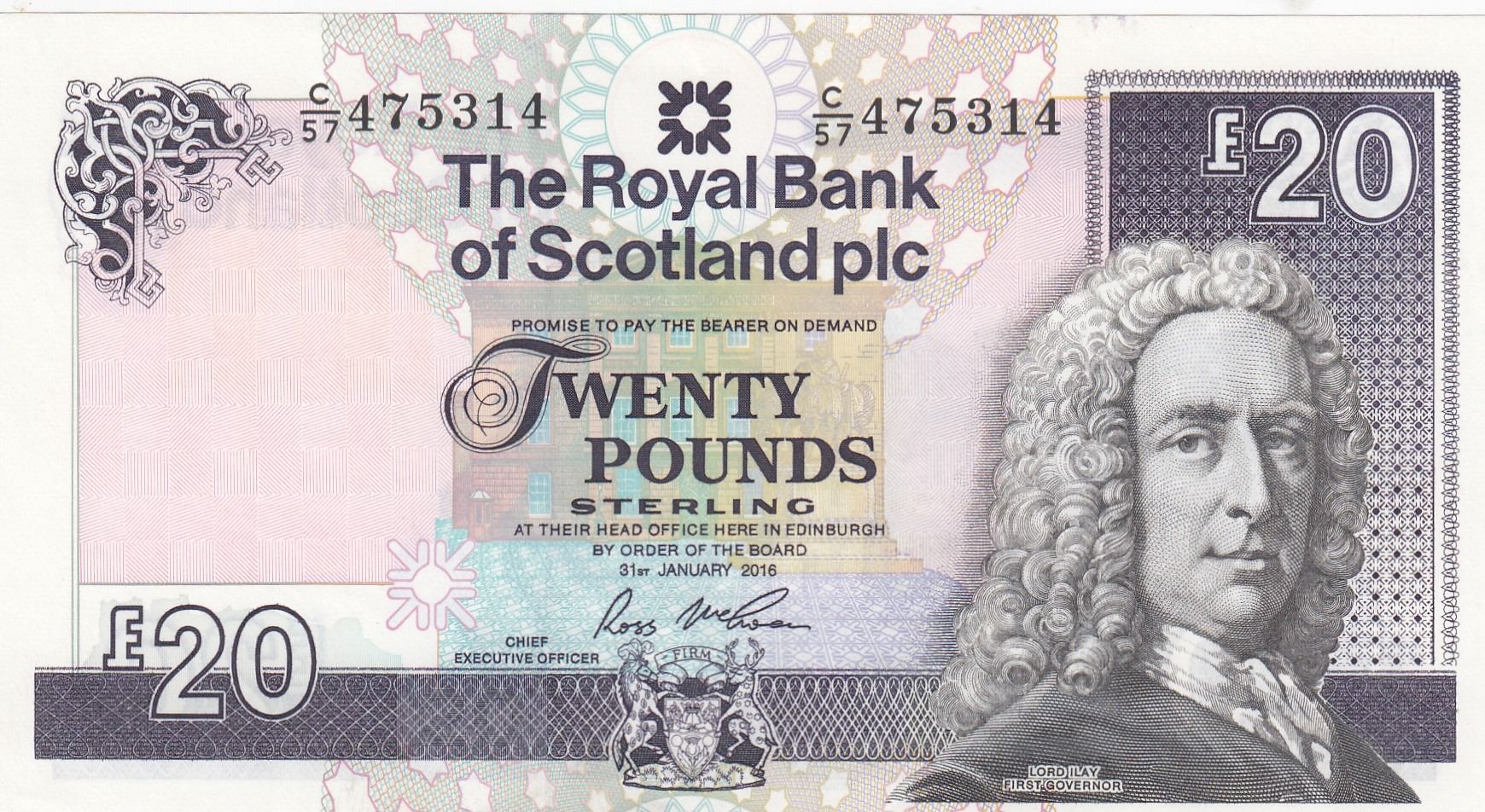 Scotland, 20 Pounds, 2016, UNC, p374fbr/serial number: C/57 475314