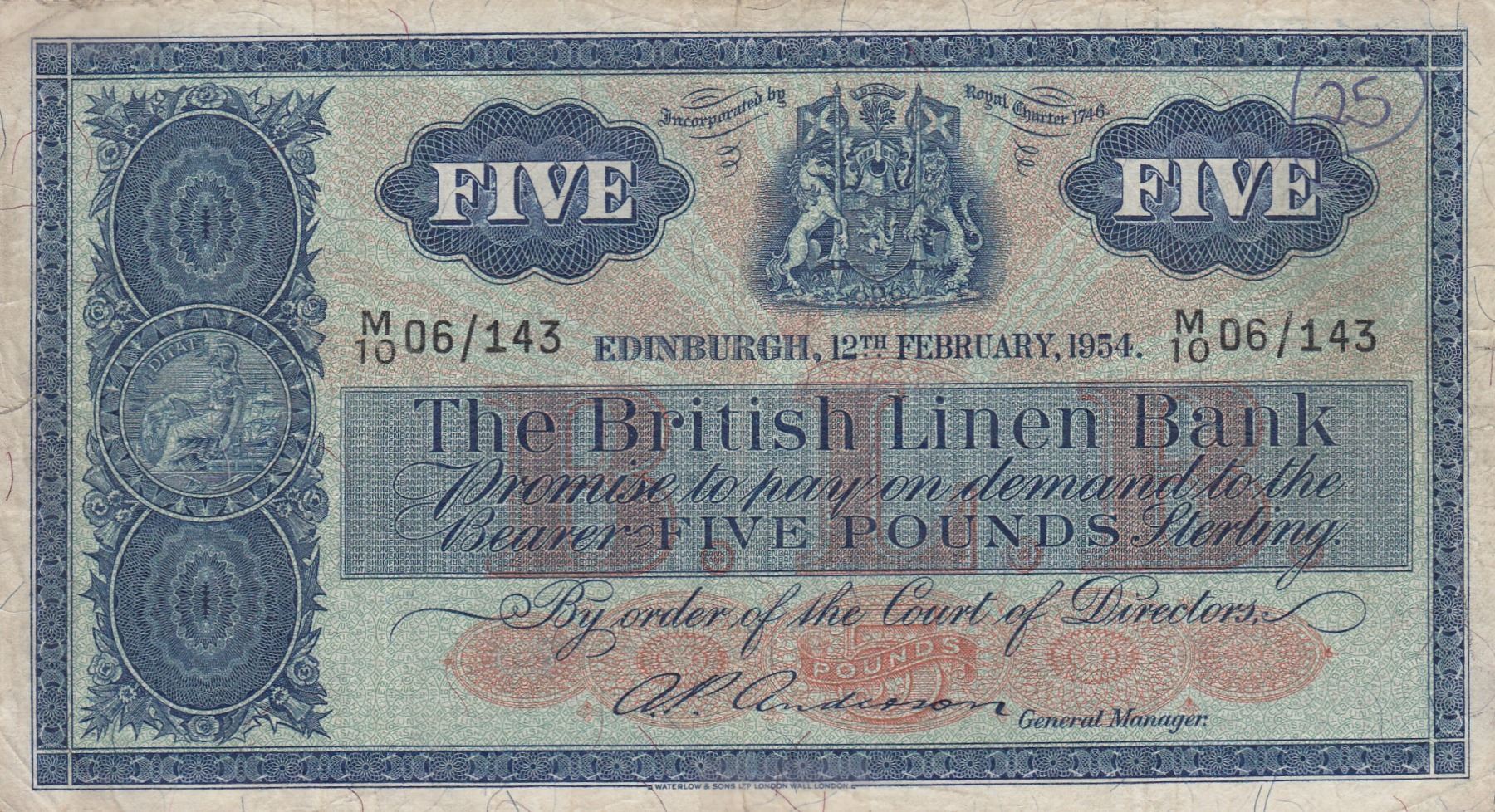 Scotland, 5 Pounds, 1954, VF, p161br/The British Linen Bank, serial number: M10 06/143