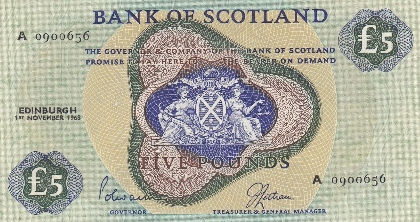 Scotland, 5 Pounds, 1968, AUNC, p110abr/serial number: A 0900656