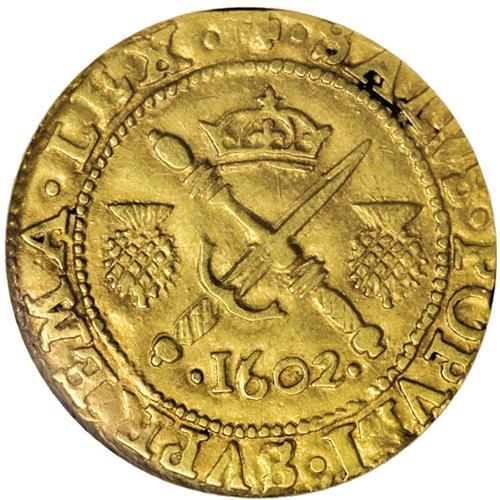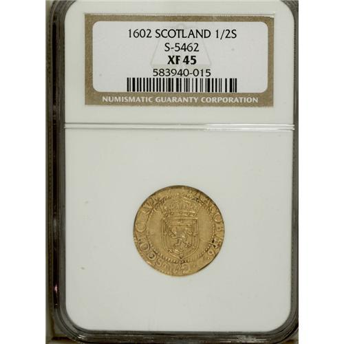<B>James VI gold 1/2 sword and sceptre 1602,</B></I> Sword and sceptre with the date/Crowned shield, S-5462, F-47, KM-19, XF45 NGC. Well struck for the issue with light marks consistent with the grade. A pleasing example of James VI's final Scottish gold type before his accession to the English throne.<BR><BR><b>Shipping:</b> Coins & Currency (<a target="_blank" href="http://www.heritageauctions.com/common/shipping.php">view shipping information</a>)