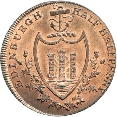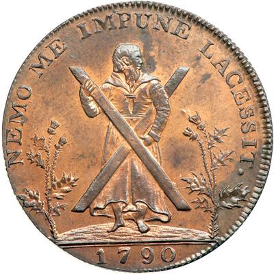 Scotland. Lothian. Edinburgh. Farthing, 1790. D&H-62. by Westwood for sale to collectors. Edge: Milled. St. Andrew with cross. Reverse: Arms of Edinburgh. Scarce. NGC graded MS-65 Red & Brown.