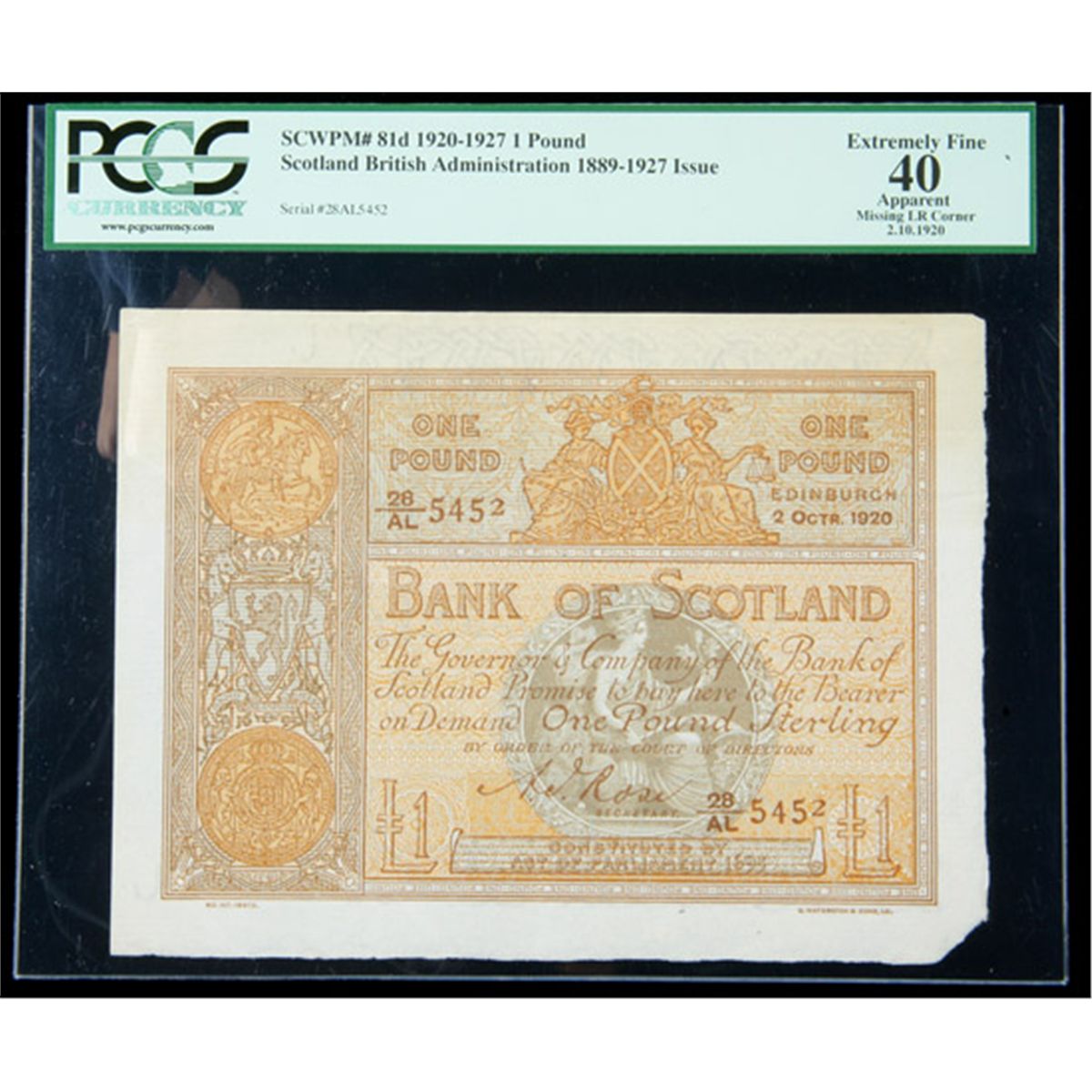Scotland SCWPM# 81d, 2.10.1920 1 Pound. PCGS Extremely Fine 40 Apparent. . Fr-P-81d. Although this piece is missing the LR corner of the margin, it is a relatively high grade example of a very collectible issue that is seldom seen in high grades.