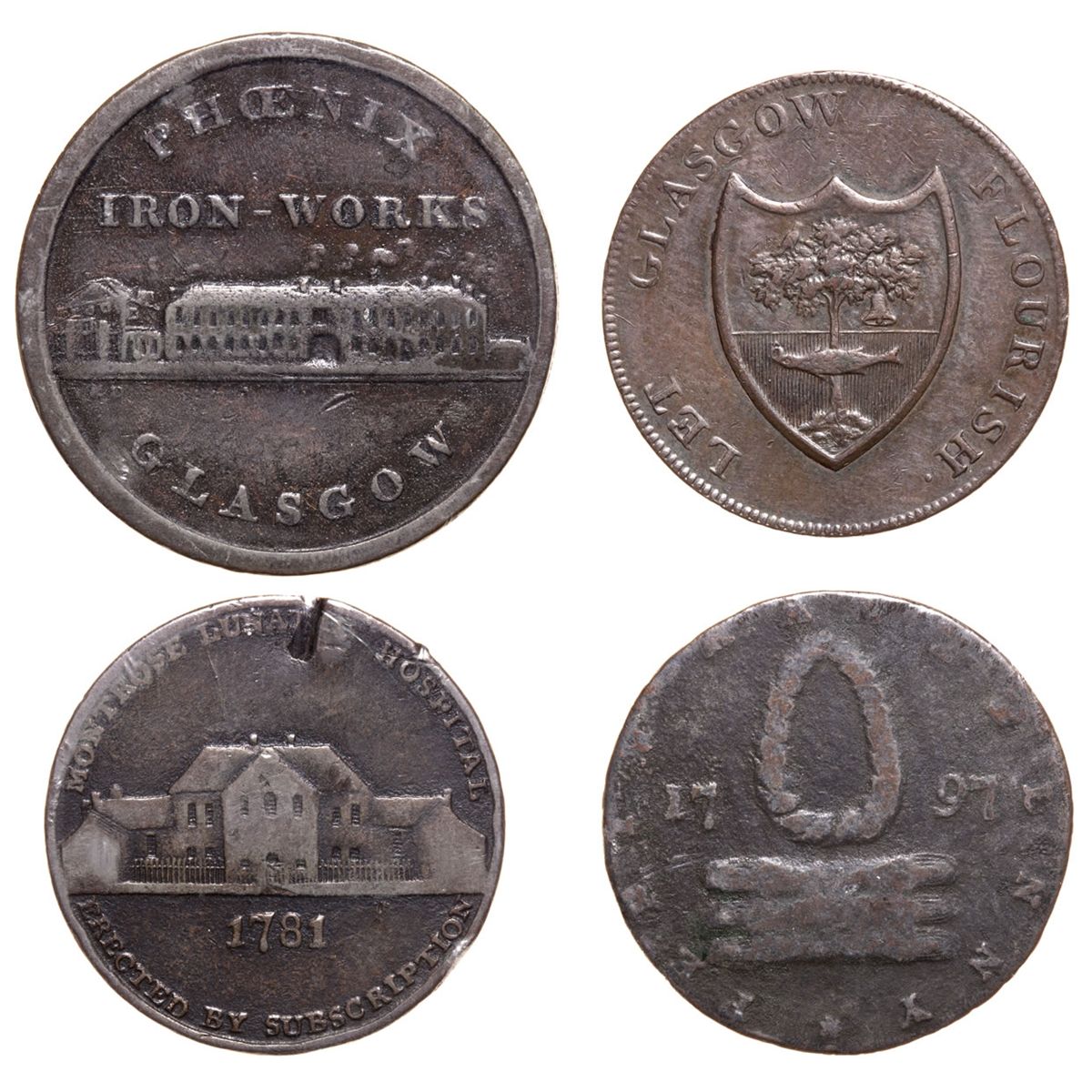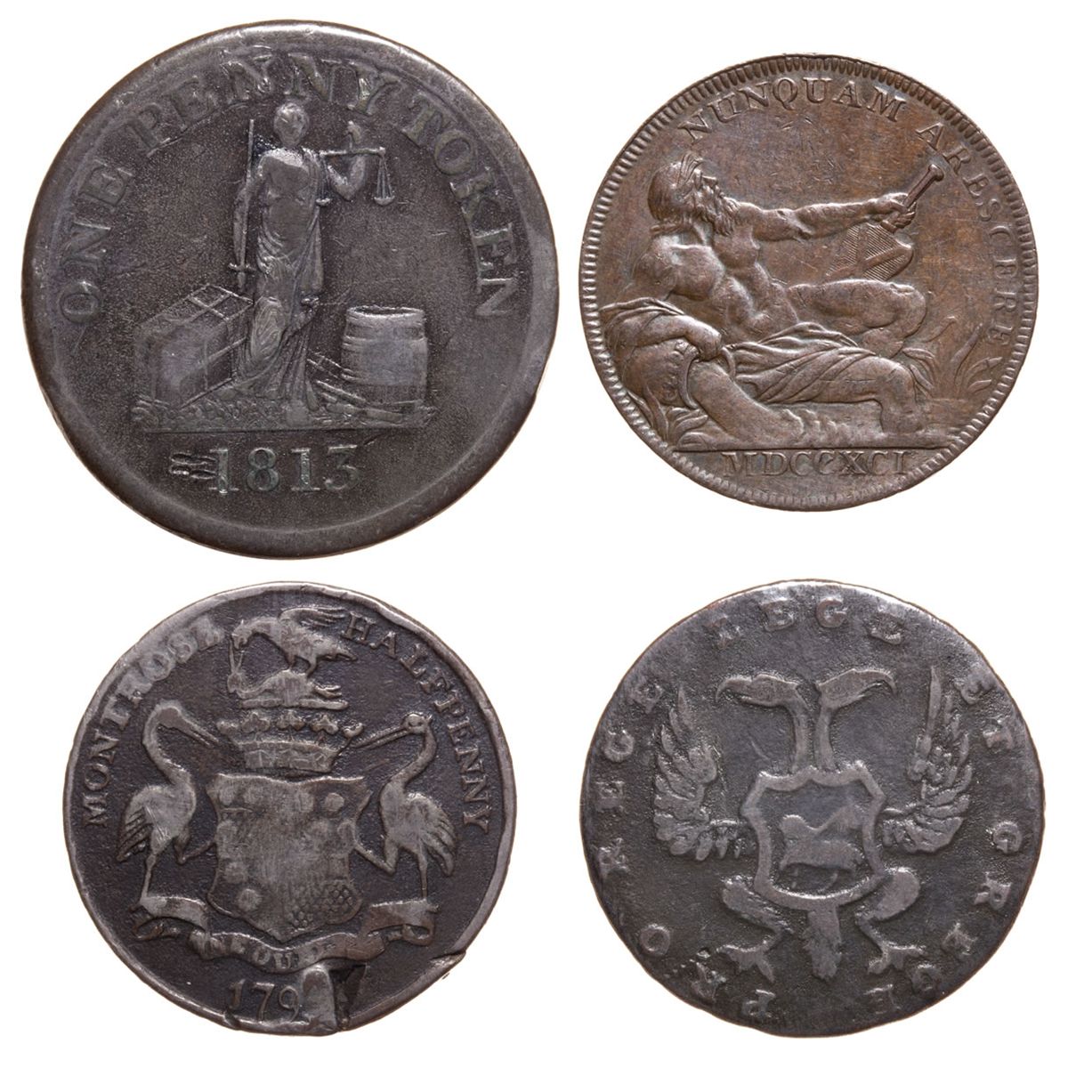 Half pence 1781-1813. Condor tokens x 4; Perth – VF, Montrose – VF (edge damage) and Glasgow 1791 – Choice AU, Glasgow 1813 VF. Very Fine or better. Lot of four (4) pieces.