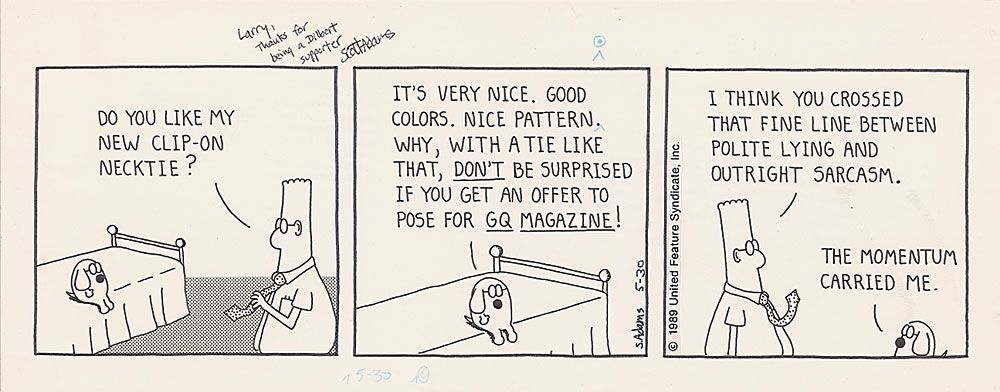 Original hand-inked three panel Dilbert daily comic strip, dated May 30, 1989, on a 14 x 5.5 off-white sheet of artist’s cardstock. Strip shows Dogbert criticizing Dilbert’s polka-dot tie, which is not missed by Dilbert. Signed vertically in the second panel, “S. Adams,” and signed and inscribed again in the top border, “Larry, thanks for being a Dilbert supporter, Scott Adams.” In fine condition. Created during the first two months of what would becoming a decades-long run—celebrating its 25th year of publication this April—and showing Dilbert wearing a different tie than in nearly every other strip, this is an incredibly rare piece of comic art: the first original Dilbert daily we have ever offered.