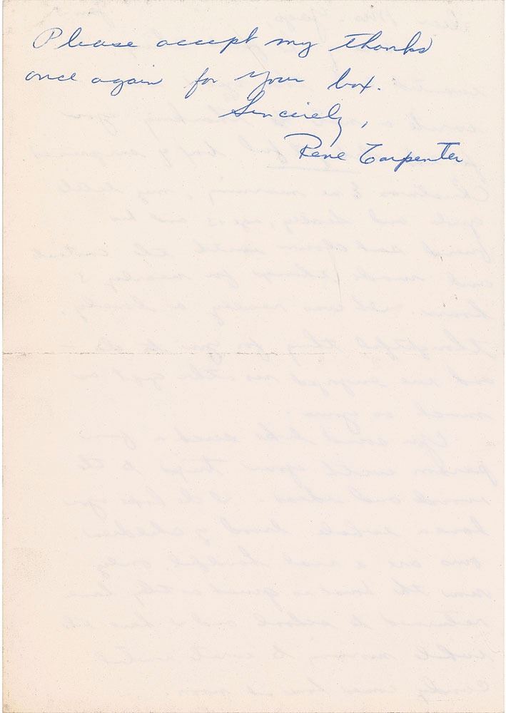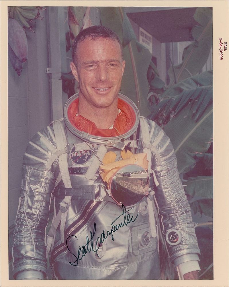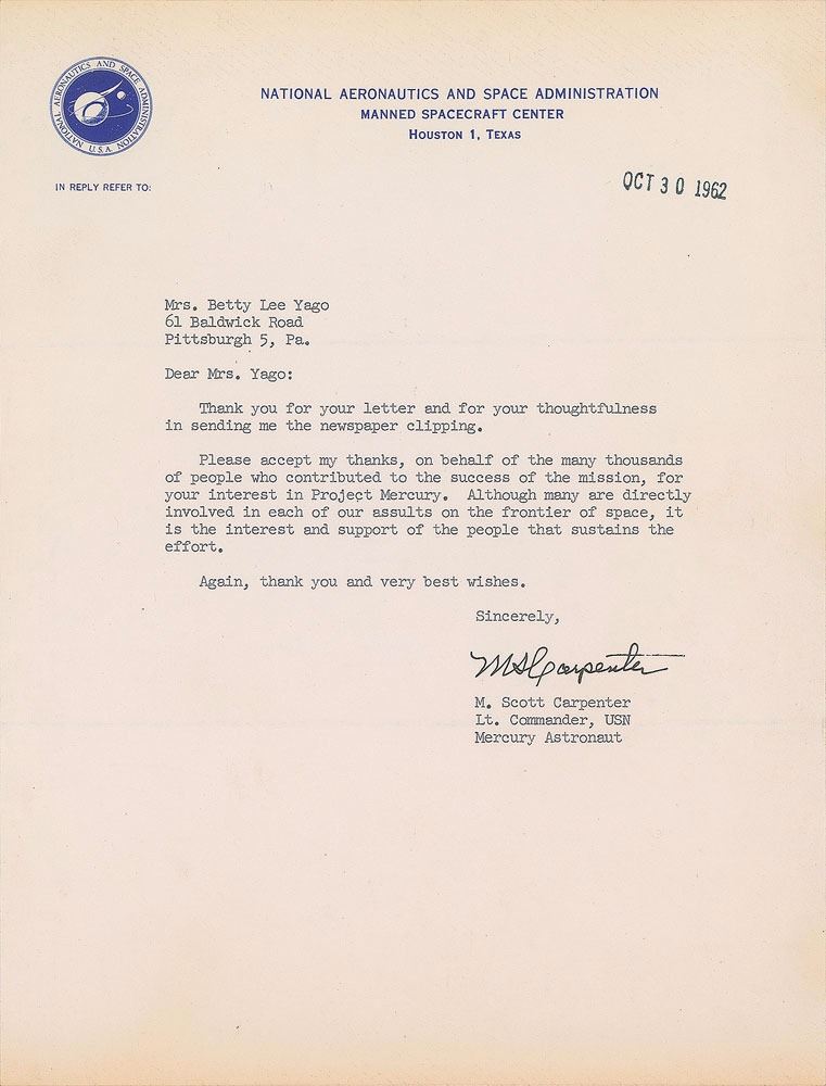 Two items: a TLS signed "M. S. Carpenter," one page, 8 x 10.5, NASA letterhead, October 30, 1962, in part: "Please accept my thanks, on behalf of the many thousands of people who contributed to the success of the mission, for your interest in Project Mercury. Although many are directly involved in each of our assults [sic] on the frontier of space, it is the interest and support of the people that sustains the effort"; and an official color satin-finish 8 x 10 red-numbered NASA photo of Carpenter in his Mercury space suit, signed in black felt tip, "Scott Carpenter." Reverse of the photo bears "This paper manufactured by Kodak" watermarks. In overall fine condition. Accompanied by an ALS by his wife, Rene Carpenter.