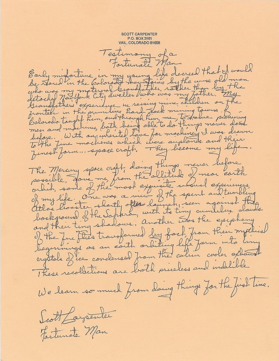 Souvenir handwritten autobiographical statement entitled “Testimony of a Fortunate Man,” one page, 8.5 x 11, personal letterhead, no date. In part: “The Mercury space craft, doing things never before possible, gave me, from the altitude of near earth orbit, some of the most exquisite unusual experiences of my life. One was a view of the spent and tumbling Atlas booster, shortly after launch, seen against the background of the Sahara, with its tiny cumulus clouds and their tiny shadows.” Includes a satin-finish 10 x 8 photo of Carpenter peering into the capsule, signed and inscribed in silver ink, “To Roy—all best, Scott Carpenter.” In fine condition.