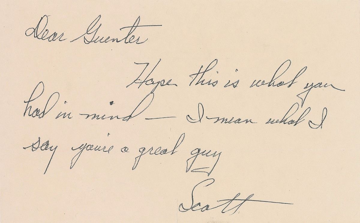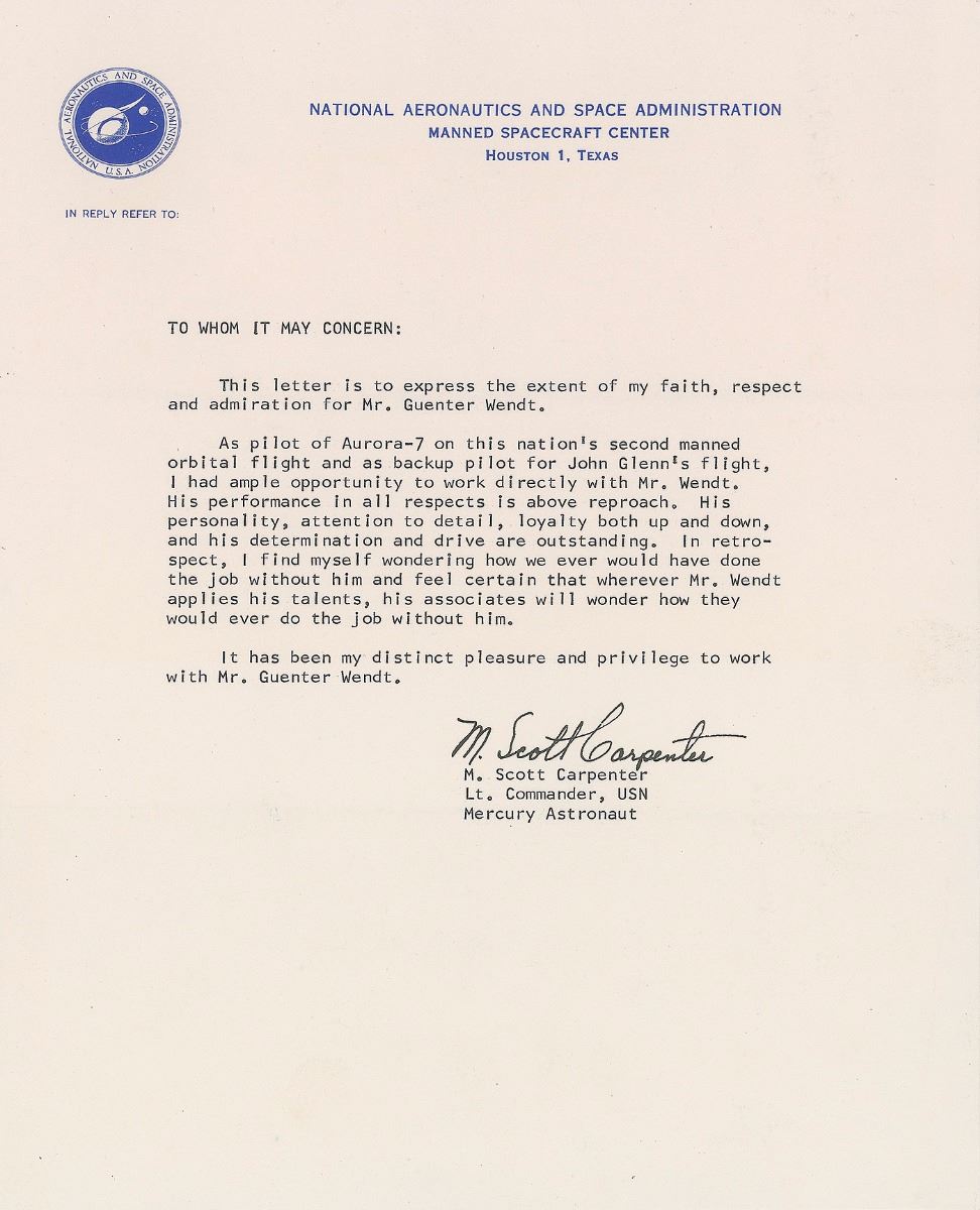 Three items: a TLS signed “M. Scott Carpenter,” one page, 8 x 10.5, NASA letterhead, no date but circa 1963, in part: “This letter is to express the extent of my faith, respect and admiration for Mr. Guenter Wendt. As pilot of Aurora-7 on this nation’s second manned orbital flight and as backup pilot of John Glenn’s flight, I had ample opportunity to work directly with Mr. Wendt…In retrospect, I find myself wondering how we ever would have done the job without him and feel certain that wherever Mr. Wendt applies his talents, his associates will wonder how they would ever do the job without him”; an ANS signed “Scott,” one page, 8 x 5, no date, apparently transmitting the recommendation, in full: “Dear Guenter, Hope this is what you had in mind—I mean what I say you’re a great guy”; and an official glossy 8 x 10 NASA photo of Wendt with Carpenter preparing for a flight simulation, signed vertically in black felt tip by Wendt. In overall fine condition. The Guenter Wendt Collection, ex. Ken Havekotte.