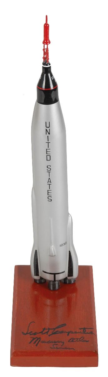 Scale model of the Mercury-Atlas launch vehicle on a wooden base, measuring an overall 12.5? tall, signed on the base in black felt tip, “Scott Carpenter, Mercury Atlas Seven.” In fine condition.