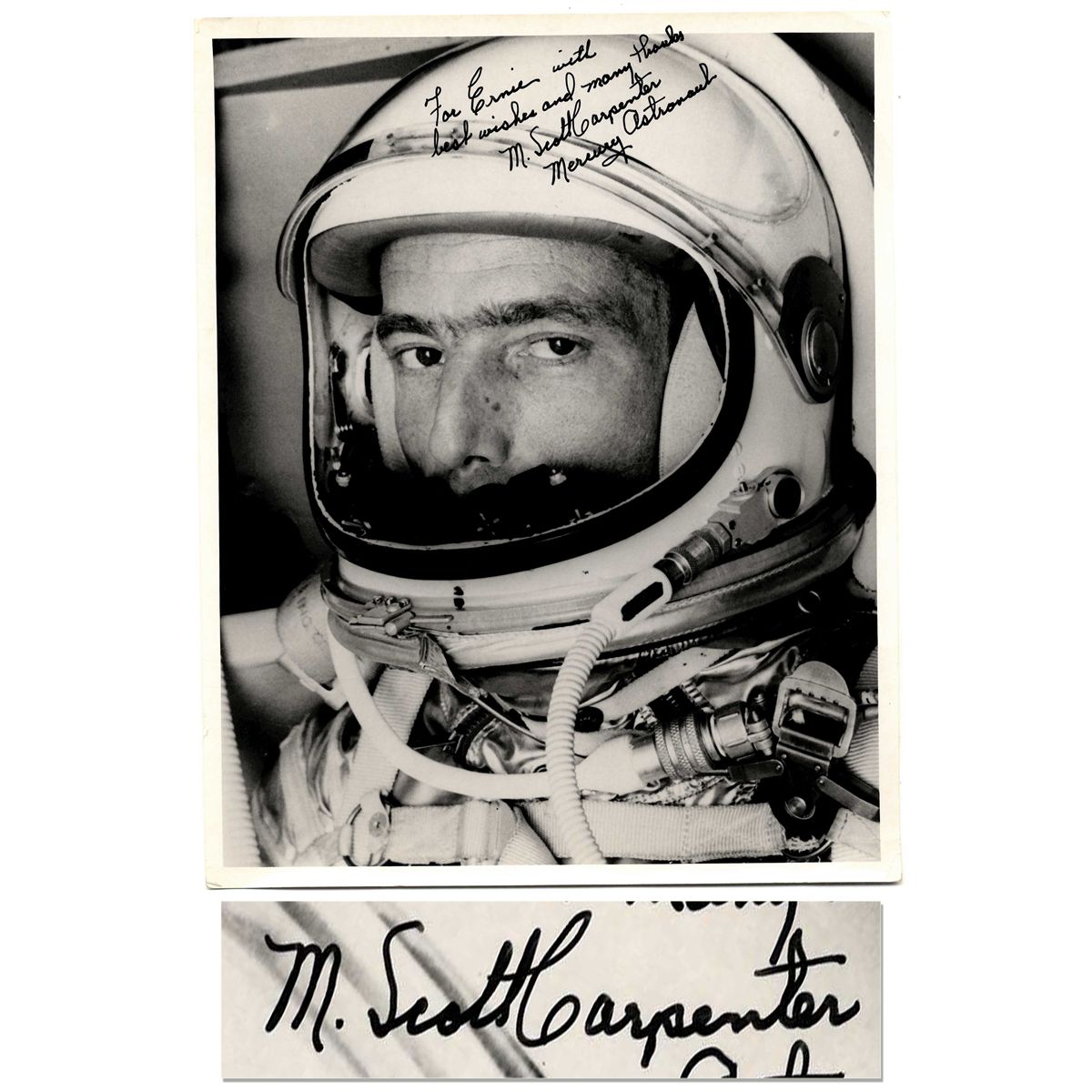 Mercury astronaut Scott Carpenter signed 8'' x 10'' glossy photo. Inscribed in Carpenter's hand ''For Ernie with best wishes and many thanks / M. Scott Carpenter / Mercury Astronaut''. Verso bears NASA insignia and is headlined ''News Release'' with date of 29 November 1961 and information on the Mercury-Atlas 6 mission. Toning to verso's lower edge, else near fine. Accompanied by an LOA from the Trustee of the Estate of Marion Linn Letsch, wife of NASA aerospace engineer Ernst Letsch.