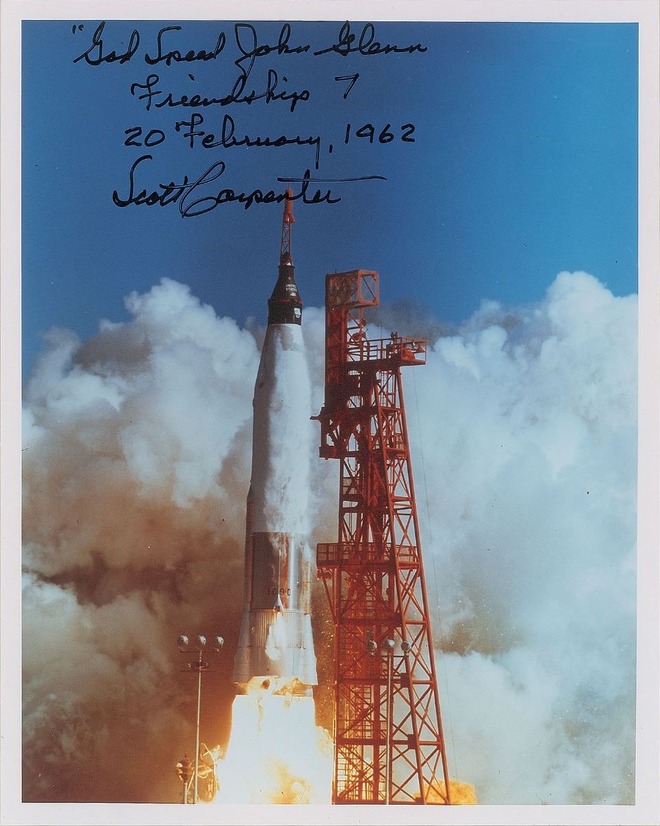 Brilliant color satin-finish 8 x 10 photo of the Friendship 7 liftoff on February 20, 1962, signed in black felt tip, “‘God Speed John Glenn, Friendship 7, 20 February, 1962, Scott Carpenter.” In fine condition.