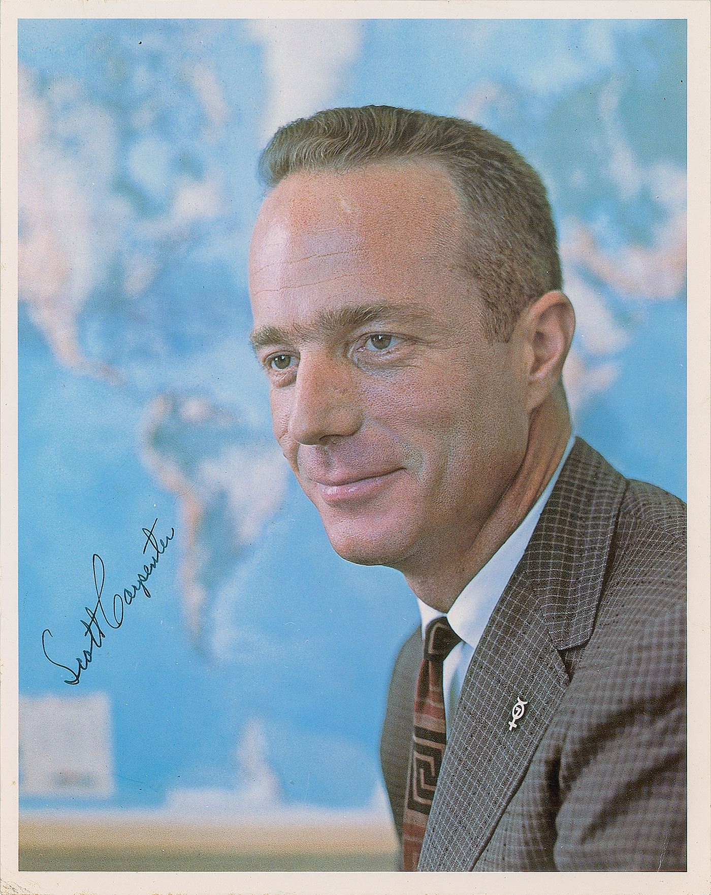 Official color 8 x 10 NASA lithograph of Carpenter in a suit and tie, showing off a Mercury 7 pin on his lapel, signed in black ink, "Scott Carpenter." In fine condition, with a crease to the lower right corner.