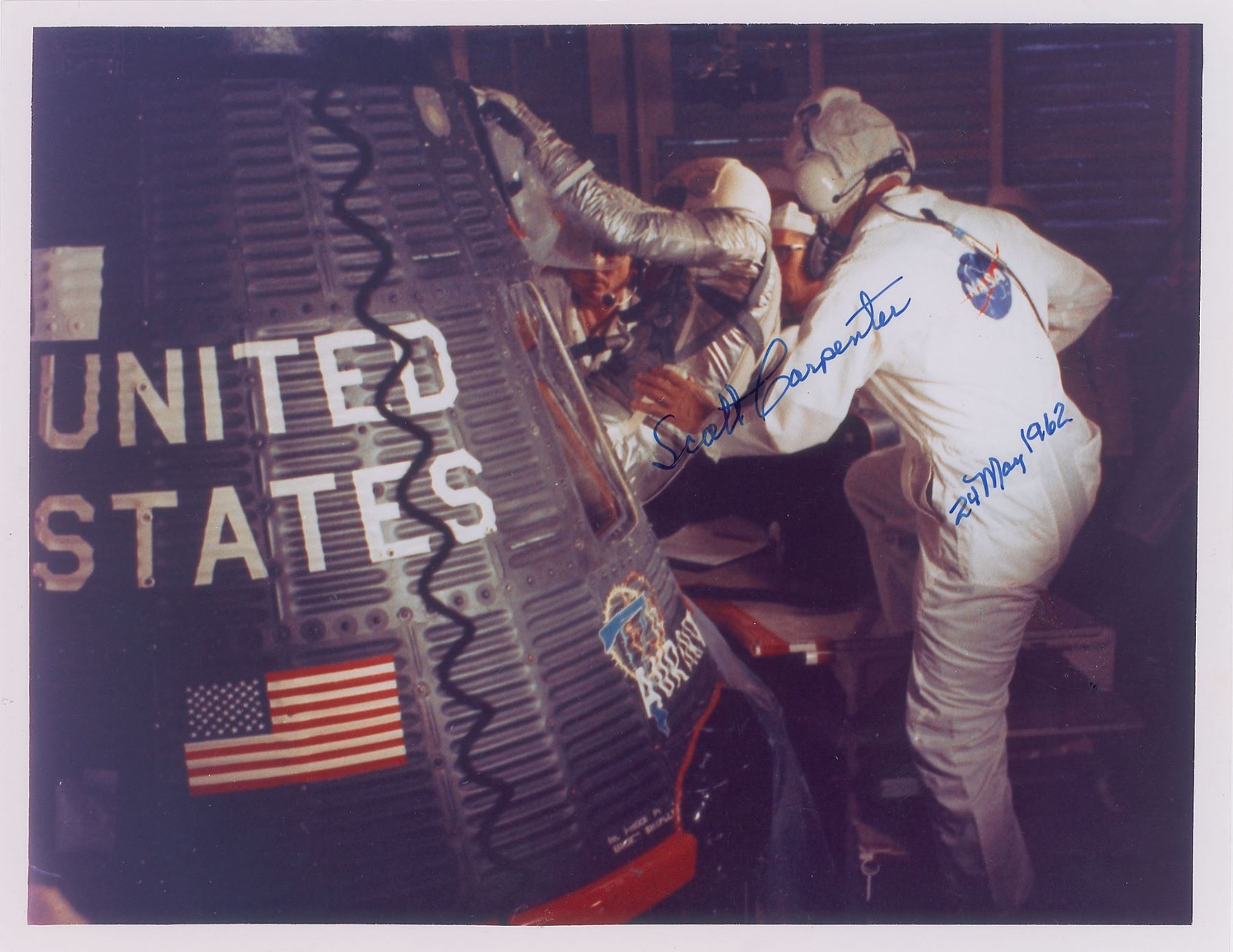 Color semi-glossy 10 x 8 photo of the intrepid pilot of the fourth Mercury Project mission making his way into the Aurora 7 capsule, signed in thin blue felt tip, "Scott Carpenter, 24 May 1962." Reverse of photo bears an affixed label from The Spacesource. In fine condition.