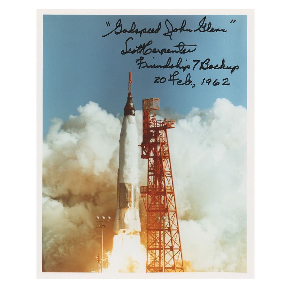 Vivid color semi-glossy 8 x 10 photo of the fiery liftoff of the Mercury-Atlas 6, signed in black felt tip, "'Godspeed John Glenn,' Scott Carpenter, Friendship 7 Backup, 20 Feb., 1962." In very fine condition.