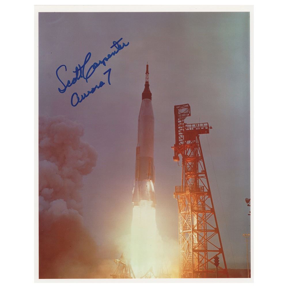 Color satin-finish 8 x 10 photo of the Mercury-Atlas 7 liftoff from Cape Canaveral, signed in blue felt tip, "Scott Carpenter, Aurora 7." In very fine condition.