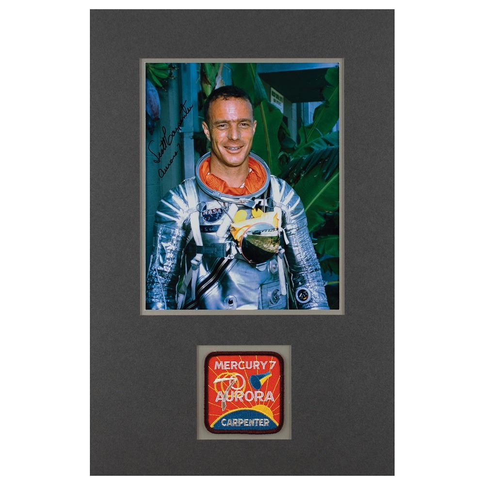 Color satin-finish 8 x 10 photo of Carpenter in his silver Mercury suit, signed in black felt tip, "Scott Carpenter, Aurora 7." Nicely double-matted above an embroidered Aurora 7 mission patch to an overall size of 11.5 x 17.75. In fine to very fine condition.