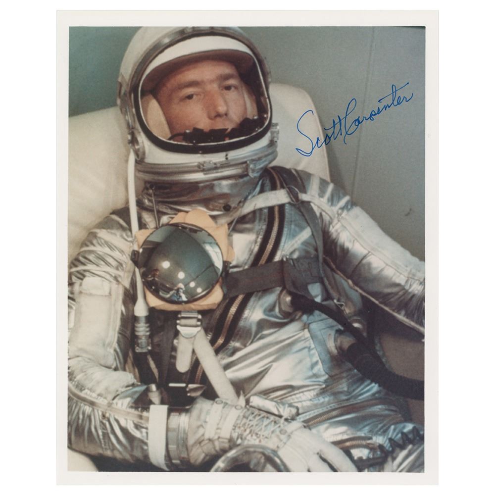 Color satin-finish 8 x 10 photo of Scott Carpenter relaxing in his silver space suit prior to his Mercury mission, signed in thin blue felt tip. In very fine condition.