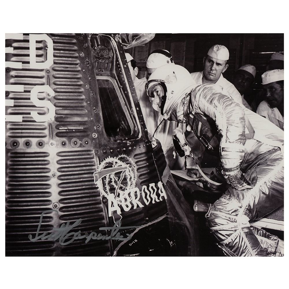 Color satin-finish 10 x 8 photo of Scott Carpenter being loaded into his Aurora 7 capsule for the Mercury-Atlas 7 mission, signed in silver ink. In very fine condition. Released as part of the 'Astronaut Autograph Club' series in 2005, the photo is accompanied by its descriptive letter bearing Carpenter's facsimile signature.