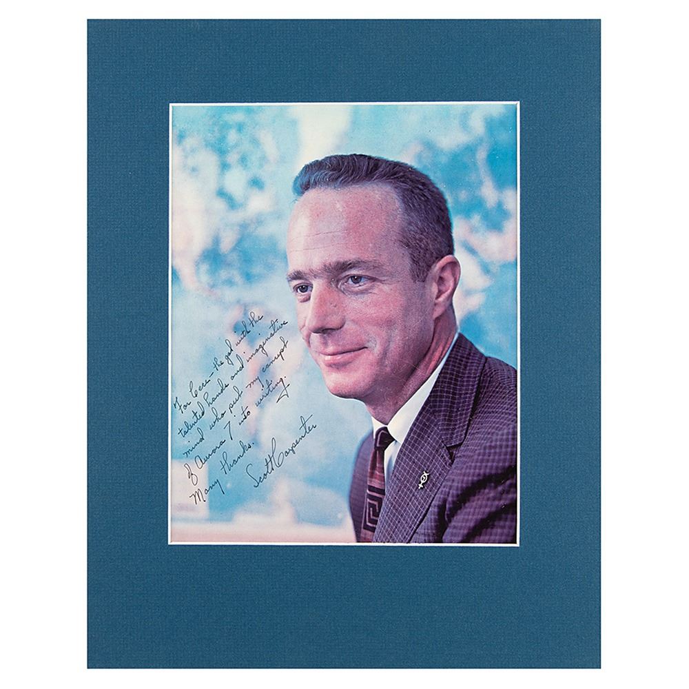 Official color 7.5 x 9.5 NASA lithograph of Carpenter in a formal pose with a Mercury 7 pin on his lapel, signed and inscribed in black ink, "For Cece‰ÛÓthe gal with the talented hands and imaginative mind who put my concept of Aurora 7 into writing. Many thanks. Scott Carpenter.‰Û Matted to an overall size of 11 x 14. In fine condition.