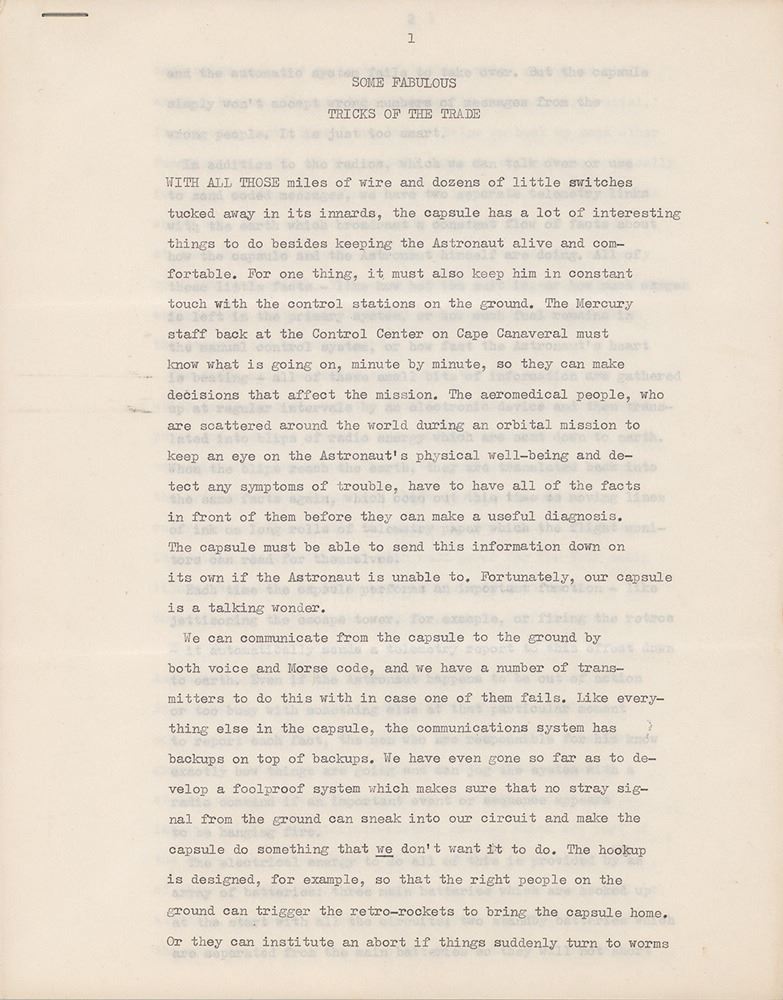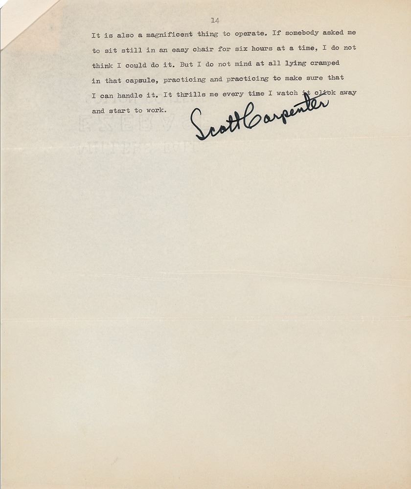 Souvenir typescript of the chapter "Some Fabulous Tricks of the Trade" from the 1962 book We Seven, 14 pages, 8.5 x 11, signed on the last page in black felt tip, "Scott Carpenter." In this chapter, Carpenter discusses the various functions and systems of the Mercury spacecraft, as well as the logistics of an orbital mission in general. In fine condition.