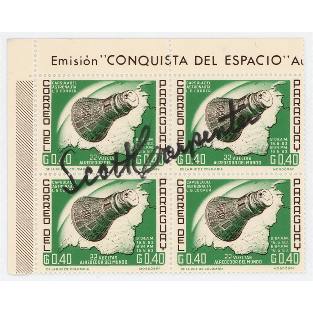 Appealing block of four Paraguayan stamps showing the Faith 7 capsule over South America, neatly signed in black felt tip, "Scott Carpenter." In fine condition.